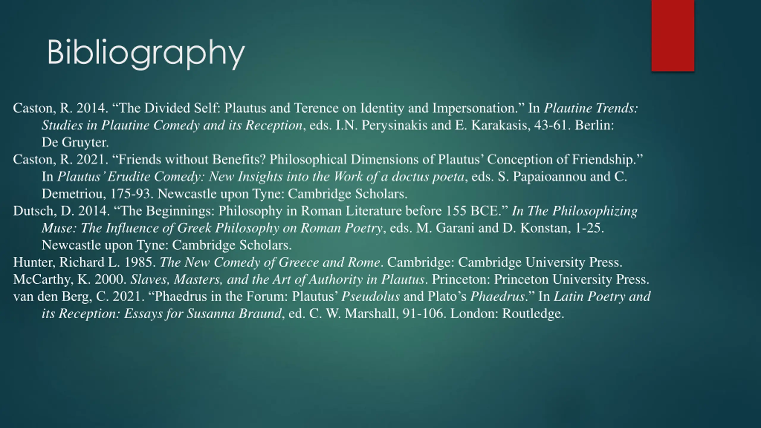 Bibliography Caston, R. 2014. The Divided Self: Plautus and Terence on Identity and Impersonation. In Plautine Trends: Studies in Plautine Comedy and its Reception, eds. I.N. Perysinakis and E. Karakasis, 43-61. Berlin: De Gruyter. Caston, R. 2021. Friends without Benefits? Philosophical Dimensions of Plautus Conception of Friendship. In Plautus Erudite Comedy: New Insights into the Work of a doctus poeta, eds. S. Papaioannou and C. Demetriou, 175-93. Newcastle upon Tyne: Cambridge Scholars. Dutsch, D. 2014. The Beginnings: Philosophy in Roman Literature before 155 BCE. In The Philosophizing Muse: The Influence of Greek Philosophy on Roman Poetry, eds. M. Garani and D. Konstan, 1-25. Newcastle upon Tyne: Cambridge Scholars. Hunter, Richard L. 1985. The New Comedy of Greece and Rome. Cambridge: Cambridge University Press. McCarthy, K. 2000. Slaves, Masters, and the Art of Authority in Plautus. Princeton: Princeton University Press. van den Berg, C. 2021. Phaedrus in the Forum: Plautus Pseudolus and Plato s Phaedrus. In Latin Poetry and its Reception: Essays for Susanna Braund, ed. C. W. Marshall, 91-106. London: Routledge.