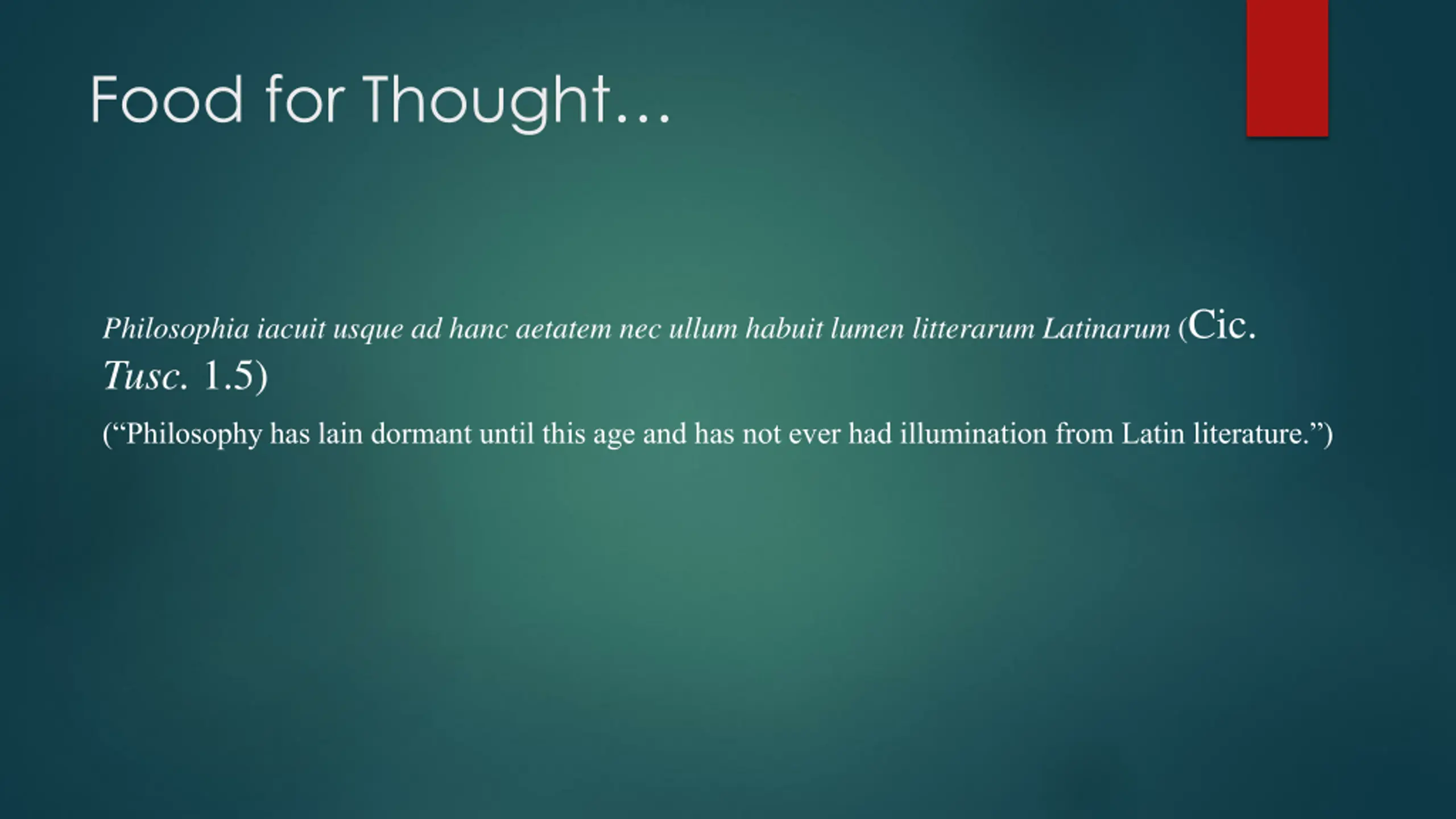 Food for Thought Philosophia iacuit usque ad hanc aetatem nec ullum habuit lumen litterarum Latinarum (Cic. Tusc. 1.5) ( Philosophy has lain dormant until this age and has not ever had illumination from Latin literature. )