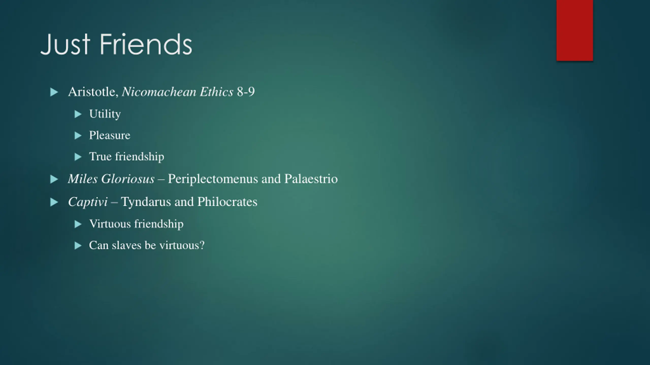 Just Friends Aristotle, Nicomachean Ethics 8-9 Utility Pleasure True friendship Miles Gloriosus Periplectomenus and Palaestrio Captivi Tyndarus and Philocrates Virtuous friendship Can slaves be virtuous?