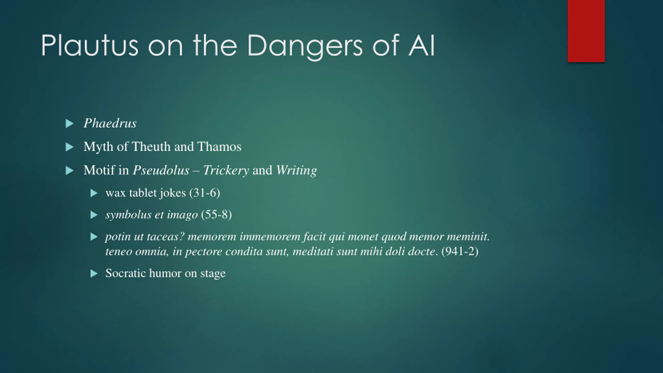 Plautus on the Dangers of AI Phaedrus Myth of Theuth and Thamos Motif in Pseudolus Trickery and Writing wax tablet jokes (31-6) symbolus et imago (55-8) potin ut taceas? memorem immemorem facit qui monet quod memor meminit. teneo omnia, in pectore condita sunt, meditati sunt mihi doli docte. (941-2) Socratic humor on stage
