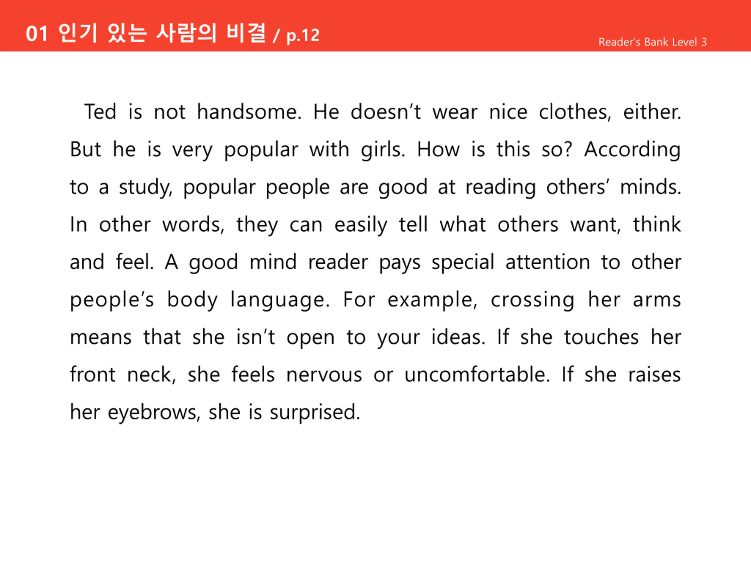 01 / p.12 Reader s Bank Level 3 Ted is not handsome. He doesn t wear nice clothes, either. But he is very popular with girls. How is this so? According to a study, popular people are good at reading others minds. In other words, they can easily tell what others want, think and feel. A good mind reader pays special attention to other people s body language. For example, crossing her arms means that she isn t open to your ideas. If she touches her front neck, she feels nervous or uncomfortable. If she raises her eyebrows, she is surprised.