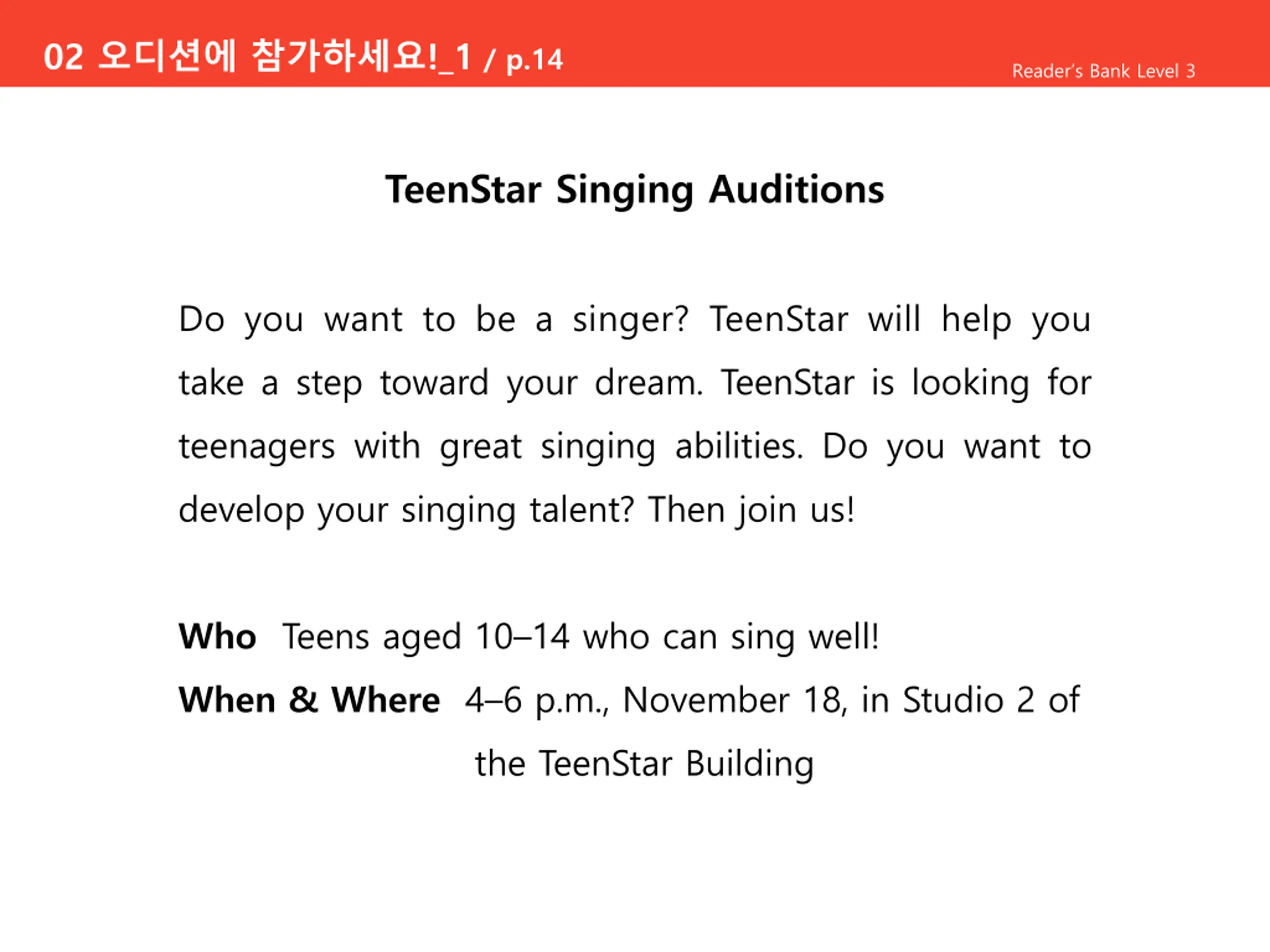 02 !_1 / p.14 Reader s Bank Level 3 TeenStar Singing Auditions Do you want to be a singer? TeenStar will help you take a step toward your dream. TeenStar is looking for teenagers with great singing abilities. Do you want to develop your singing talent? Then join us! Who Teens aged 10 14 who can sing well! When & Where 4 6 p.m., November 18, in Studio 2 of the TeenStar Building