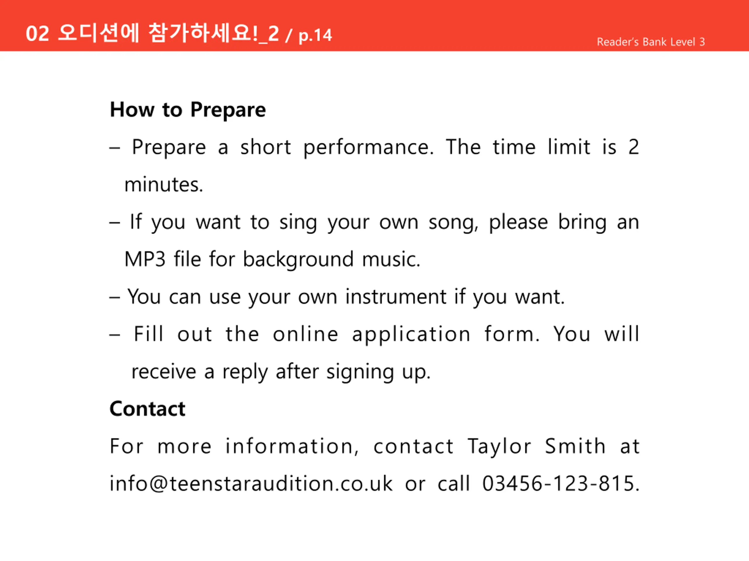 02 !_2 / p.14 Reader s Bank Level 3 How to Prepare Prepare a short performance. The time limit is 2 minutes. If you want to sing your own song, please bring an MP3 file for background music. You can use your own instrument if you want. Fill out the online application form. You will receive a reply after signing up. Contact For more information, contact Taylor Smith at info@teenstaraudition.co.uk or call 03456-123-815.