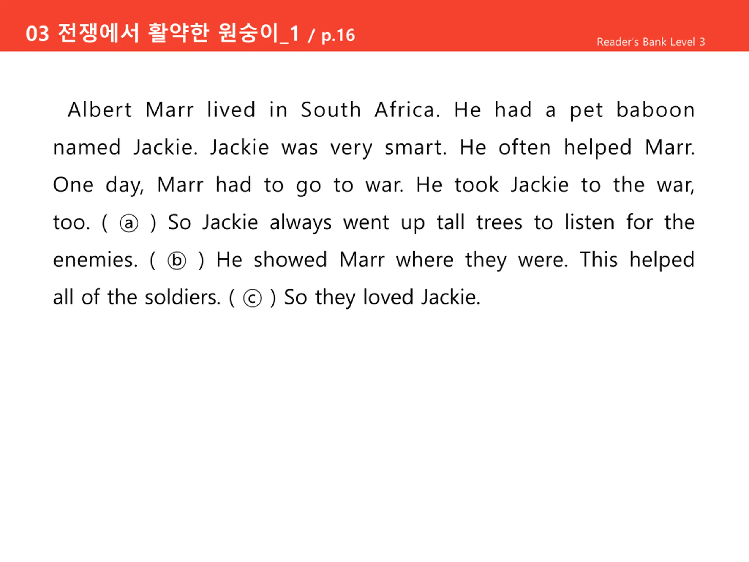 03 _1 / p.16 Reader s Bank Level 3 Albert Marr lived in South Africa. He had a pet baboon named Jackie. Jackie was very smart. He often helped Marr. One day, Marr had to go to war. He took Jackie to the war, too. ( ) So Jackie always went up tall trees to listen for the enemies. ( ) He showed Marr where they were. This helped all of the soldiers. ( ) So they loved Jackie.