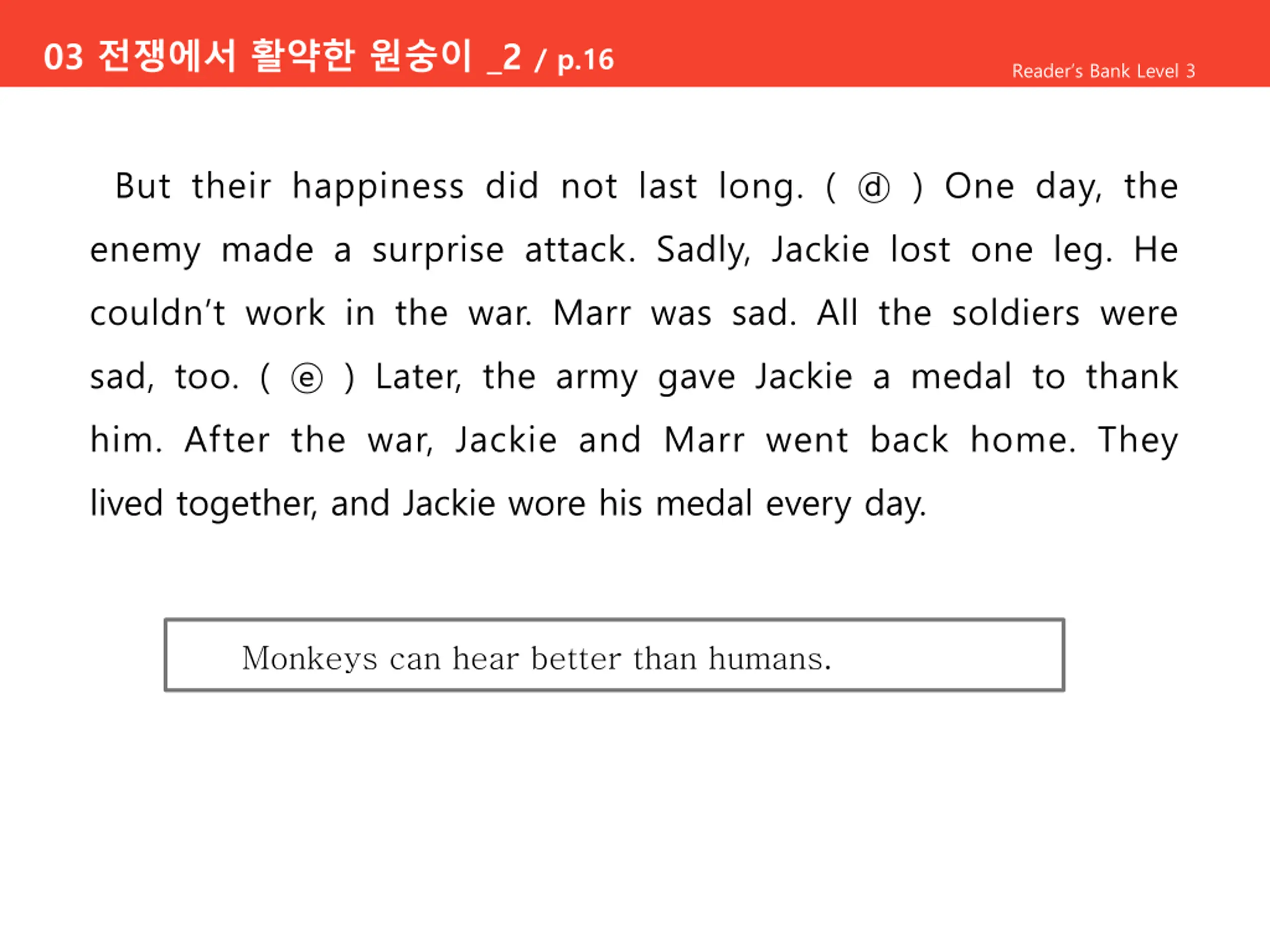 03 _2 / p.16 Reader s Bank Level 3 But their happiness did not last long. ( ) One day, the enemy made a surprise attack. Sadly, Jackie lost one leg. He couldn t work in the war. Marr was sad. All the soldiers were sad, too. ( ) Later, the army gave Jackie a medal to thank him. After the war, Jackie and Marr went back home. They lived together, and Jackie wore his medal every day. Monkeys can hear better than humans.