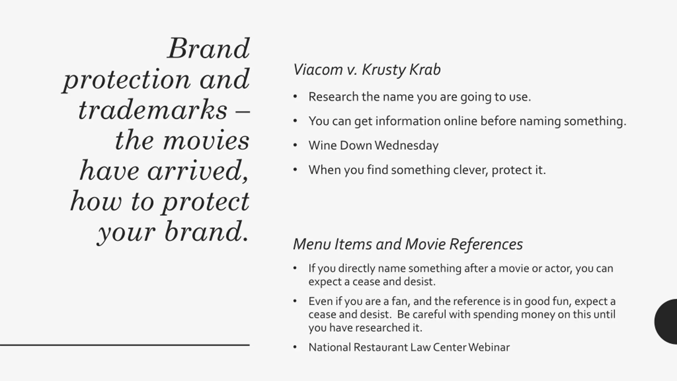 Brand protection and trademarks the movies have arrived, how to protect your brand. Viacom v. Krusty Krab Research the name you are going to use. You can get information online before naming something. Wine Down Wednesday When you find something clever, protect it. Menu Items and Movie References If you directly name something after a movie or actor, you can expect a cease and desist. Even if you are a fan, and the reference is in good fun, expect a cease and desist. Be careful with spending money on this until you have researched it. National Restaurant Law Center Webinar
