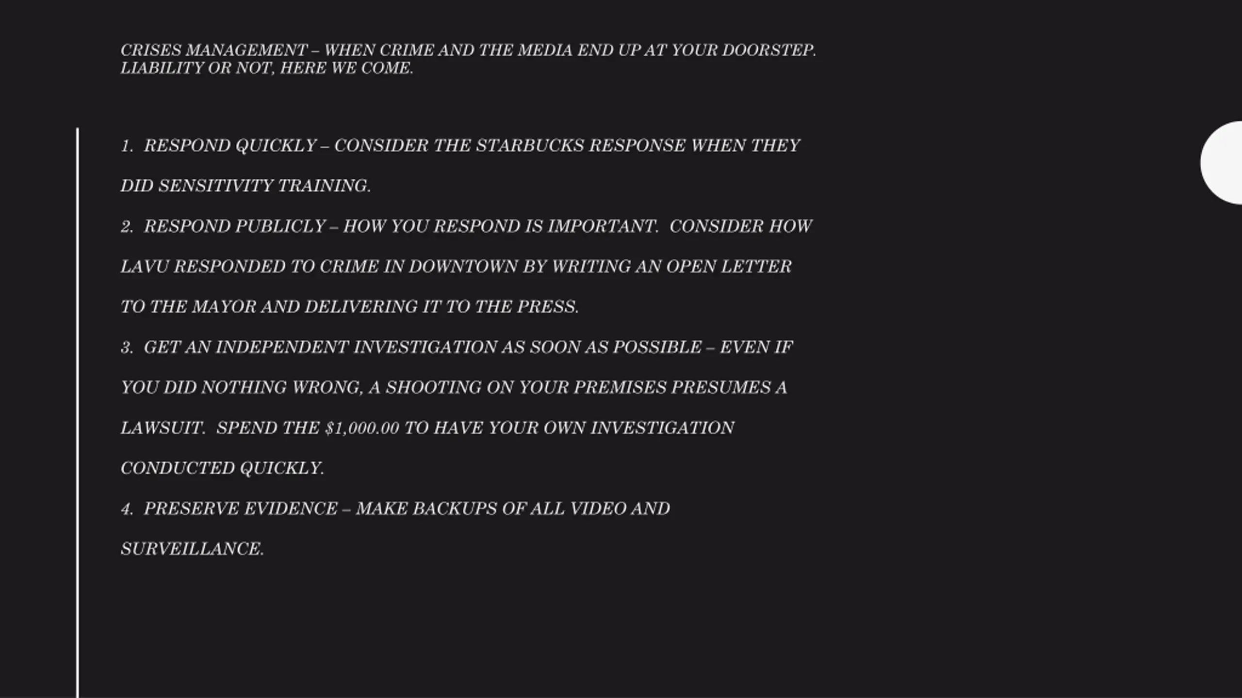 CRISES MANAGEMENT WHEN CRIME AND THE MEDIA END UP AT YOUR DOORSTEP. LIABILITY OR NOT, HERE WE COME. 1. RESPOND QUICKLY CONSIDER THE STARBUCKS RESPONSE WHEN THEY DID SENSITIVITY TRAINING. 2. RESPOND PUBLICLY HOW YOU RESPOND IS IMPORTANT. CONSIDER HOW LAVU RESPONDED TO CRIME IN DOWNTOWN BY WRITING AN OPEN LETTER TO THE MAYOR AND DELIVERING IT TO THE PRESS. 3. GET AN INDEPENDENT INVESTIGATION AS SOON AS POSSIBLE EVEN IF YOU DID NOTHING WRONG, A SHOOTING ON YOUR PREMISES PRESUMES A LAWSUIT. SPEND THE $1,000.00 TO HAVE YOUR OWN INVESTIGATION CONDUCTED QUICKLY. 4. PRESERVE EVIDENCE MAKE BACKUPS OF ALL VIDEO AND SURVEILLANCE.