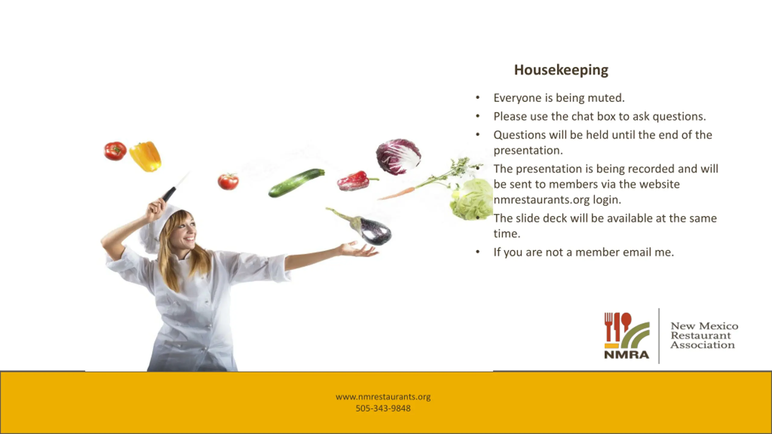Housekeeping Everyone is being muted. Please use the chat box to ask questions. Questions will be held until the end of the presentation. The presentation is being recorded and will be sent to members via the website nmrestaurants.org login. The slide deck will be available at the same time. If you are not a member email me. www.nmrestaurants.org 505-343-9848