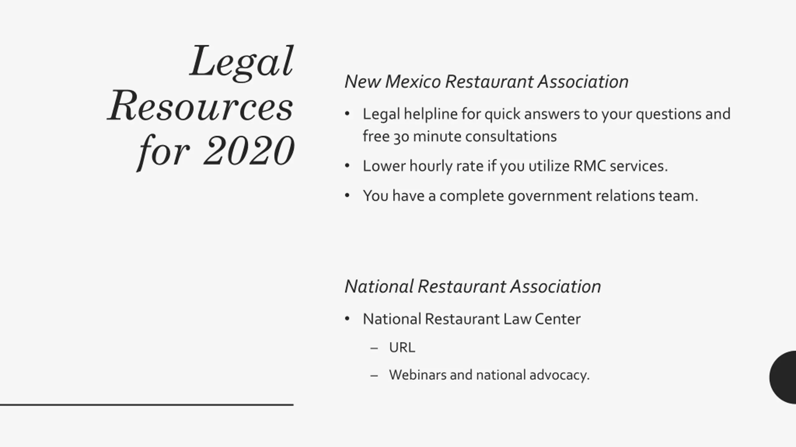 Legal New Mexico Restaurant Association Resources for 2020 Legal helpline for quick answers to your questions and free 30 minute consultations Lower hourly rate if you utilize RMC services. You have a complete government relations team. National Restaurant Association National Restaurant Law Center URL Webinars and national advocacy.