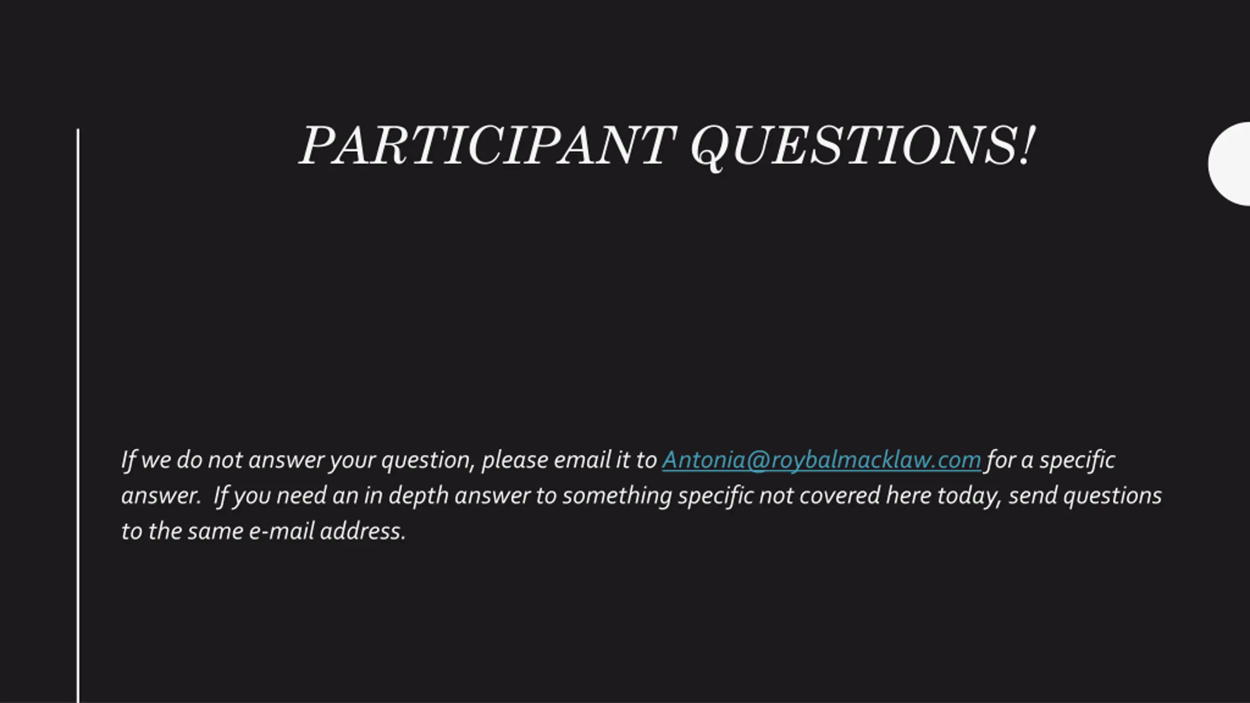 PARTICIPANT QUESTIONS! If we do not answer your question, please email it to Antonia@roybalmacklaw.com for a specific answer. If you need an in depth answer to something specific not covered here today, send questions to the same e-mail address.