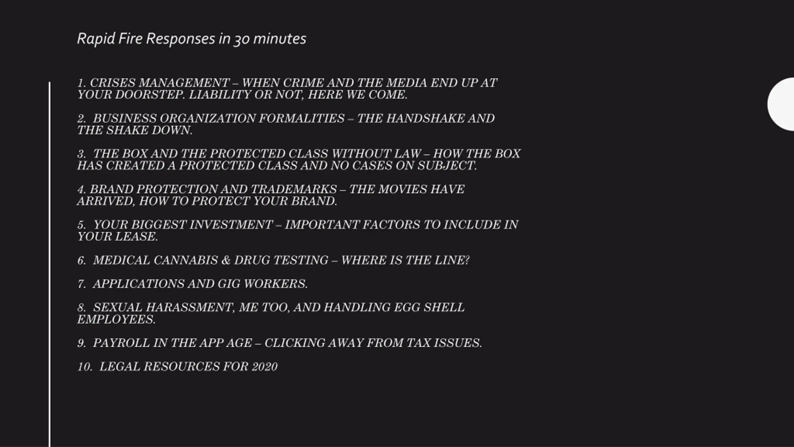 Rapid Fire Responses in 30 minutes 1. CRISES MANAGEMENT WHEN CRIME AND THE MEDIA END UP AT YOUR DOORSTEP. LIABILITY OR NOT, HERE WE COME. 2. BUSINESS ORGANIZATION FORMALITIES THE HANDSHAKE AND THE SHAKE DOWN. 3. THE BOX AND THE PROTECTED CLASS WITHOUT LAW HOW THE BOX HAS CREATED A PROTECTED CLASS AND NO CASES ON SUBJECT. 4. BRAND PROTECTION AND TRADEMARKS THE MOVIES HAVE ARRIVED, HOW TO PROTECT YOUR BRAND. 5. YOUR BIGGEST INVESTMENT IMPORTANT FACTORS TO INCLUDE IN YOUR LEASE. 6. MEDICAL CANNABIS & DRUG TESTING WHERE IS THE LINE? 7. APPLICATIONS AND GIG WORKERS. 8. SEXUAL HARASSMENT, ME TOO, AND HANDLING EGG SHELL EMPLOYEES. 9. PAYROLL IN THE APP AGE CLICKING AWAY FROM TAX ISSUES. 10. LEGAL RESOURCES FOR 2020