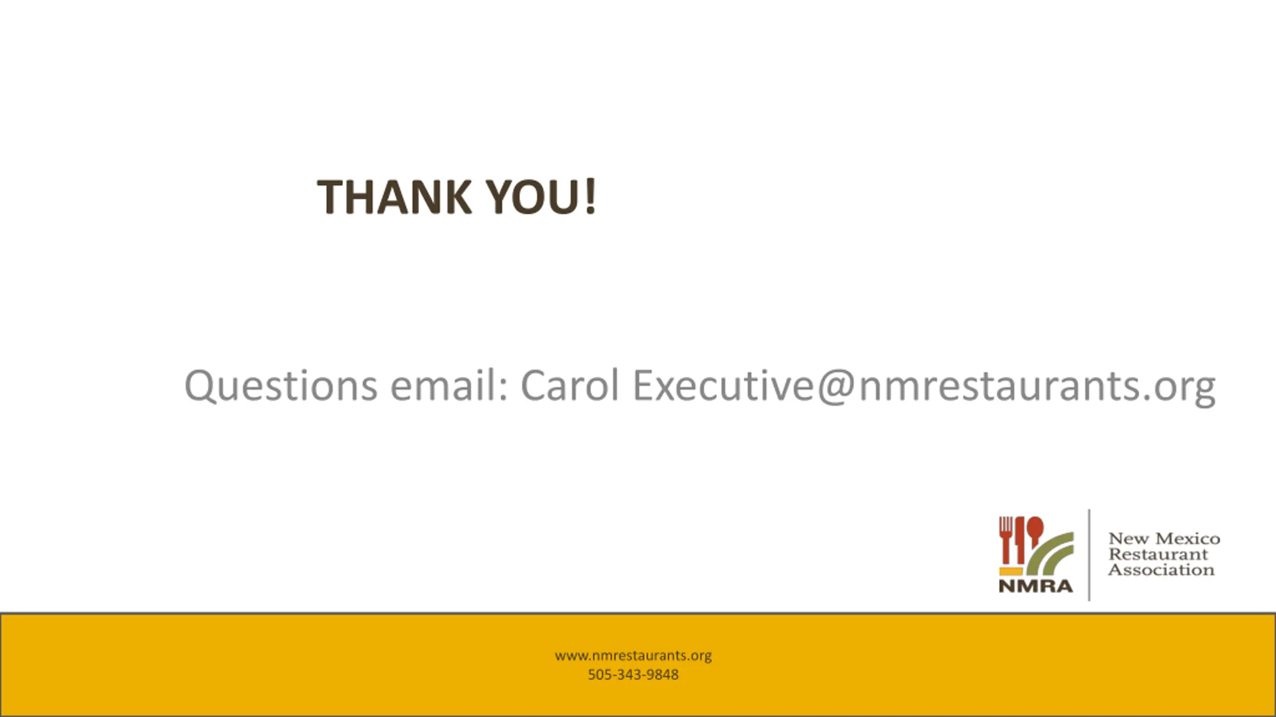 THANK YOU! Questions email: Carol Executive@nmrestaurants.org www.nmrestaurants.org 505-343-9848