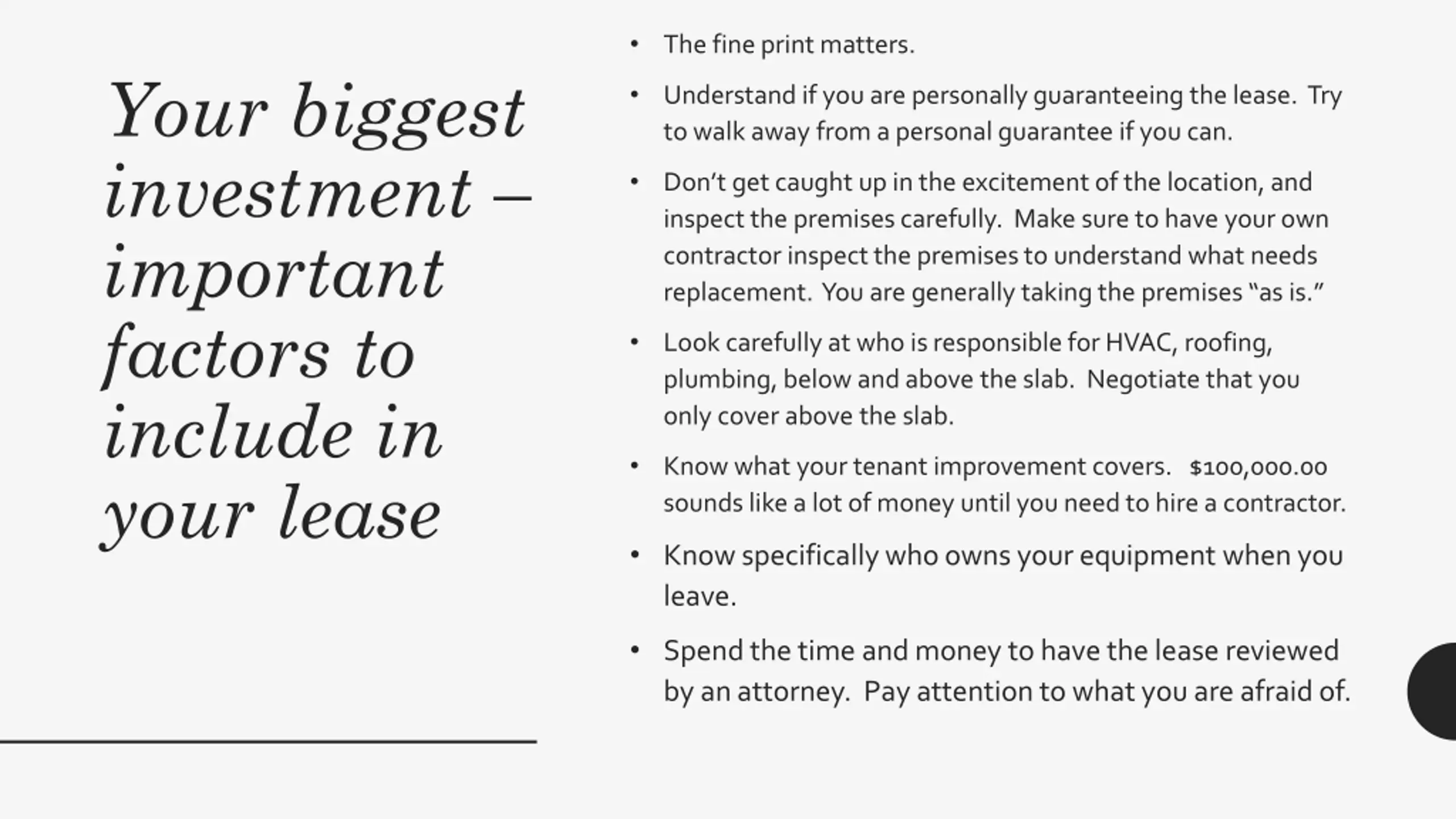 The fine print matters. Your biggest investment important factors to include in your lease Understand if you are personally guaranteeing the lease. Try to walk away from a personal guarantee if you can. Don t get caught up in the excitement of the location, and inspect the premises carefully. Make sure to have your own contractor inspect the premises to understand what needs replacement. You are generally taking the premises as is. Look carefully at who is responsible for HVAC, roofing, plumbing, below and above the slab. Negotiate that you only cover above the slab. Know what your tenant improvement covers. $100,000.00 sounds like a lot of money until you need to hire a contractor. Know specifically who owns your equipment when you leave. Spend the time and money to have the lease reviewed by an attorney. Pay attention to what you are afraid of.