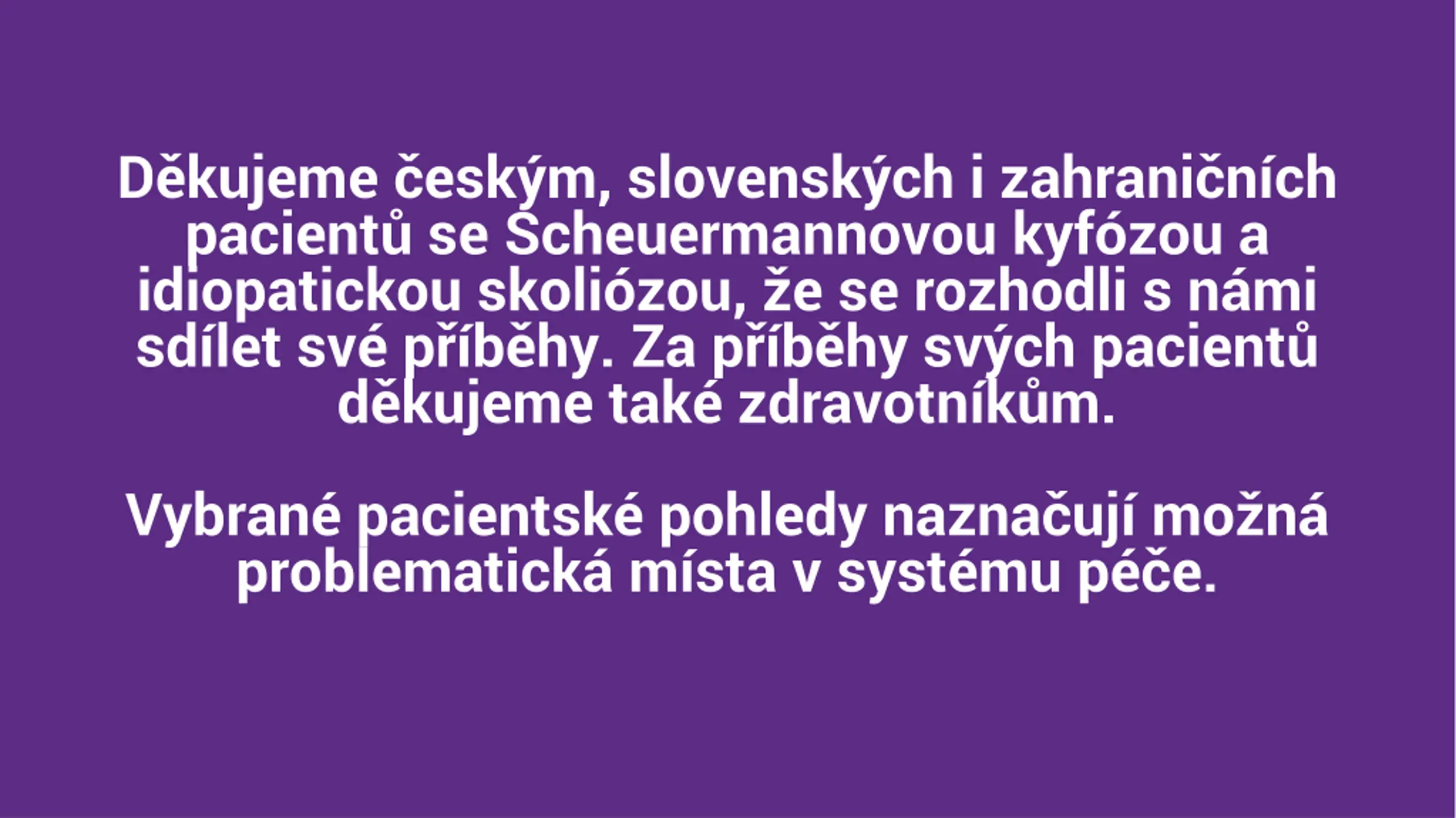 Dkujeme eskm, slovenskch i zahraninch pacient se Scheuermannovou kyf zou a idiopatickou skoli zou, e se rozhodli s n mi sd let sv p b hy. Za p b hy sv ch pacient d kujeme tak zdravotn k m. Vybran pacientsk pohledy nazna uj mo n problematick m sta v syst mu p e.