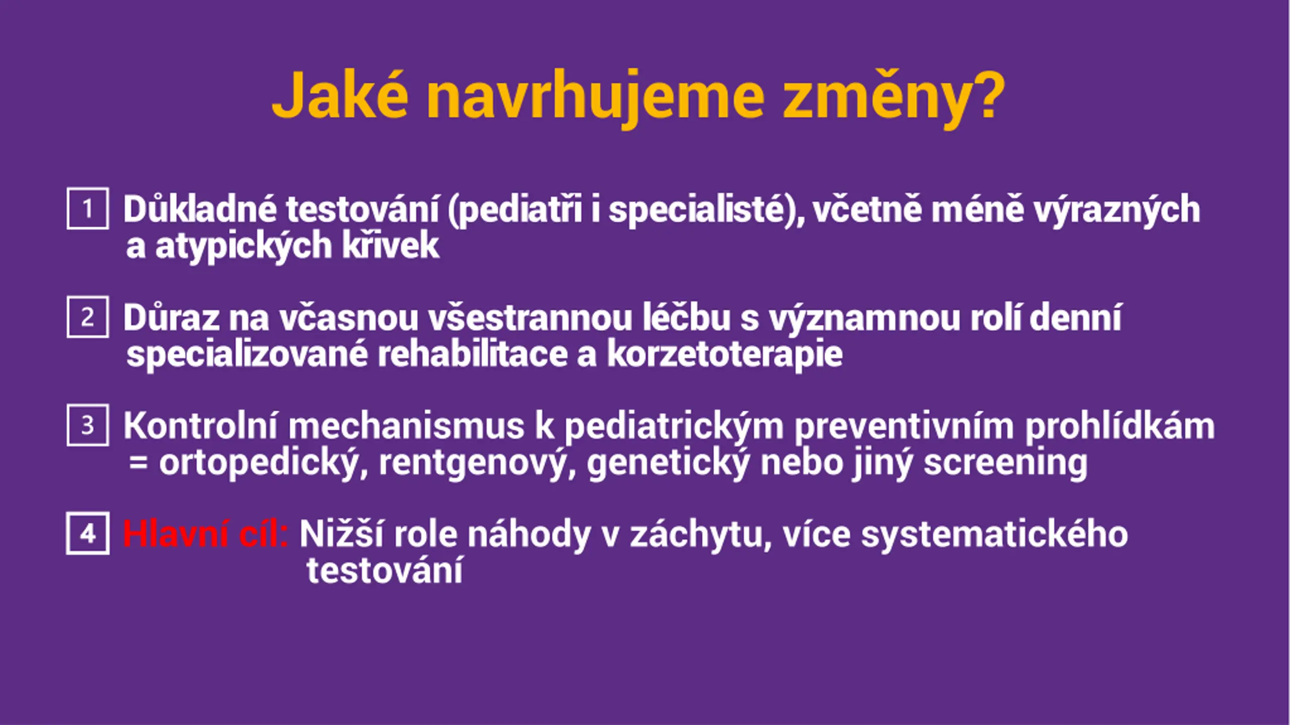 Jak navrhujeme zmny? 1 D kladn testov n (pediat i i specialist ), v etn m n v razn ch a atypick ch k ivek 2 D raz na v asnou v estrannou l bu s v znamnou rol denn specializovan rehabilitace a korzetoterapie 3 Kontroln mechanismus k pediatrick m preventivn m prohl dk m = ortopedick , rentgenov , genetick nebo jin screening 4 4 Hlavn c l: Ni role n hody v z chytu, v ce systematick ho testov n