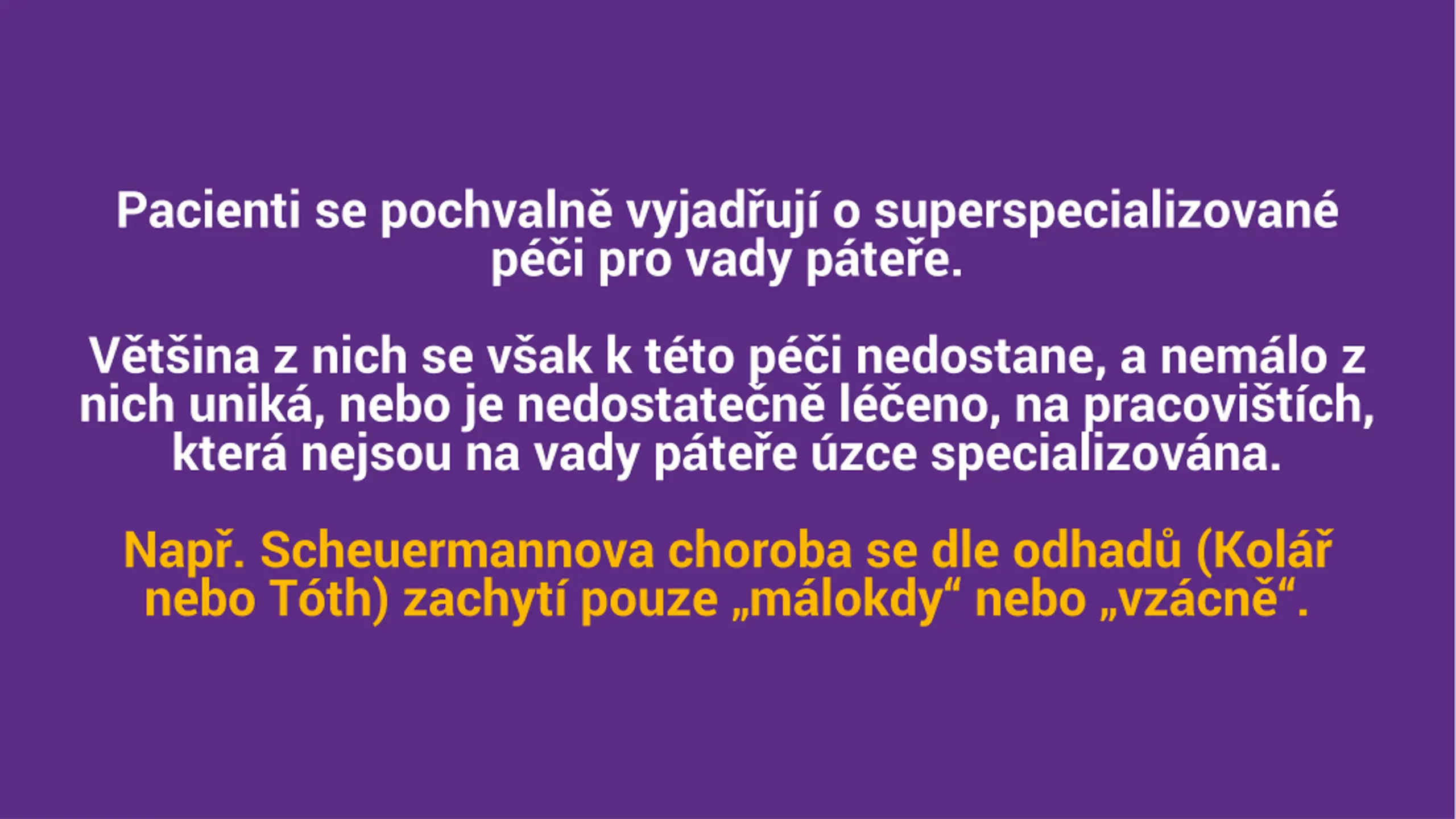 Pacienti se pochvaln vyjaduj o superspecializovan p i pro vady p te e. V t ina z nich se v ak k t to p i nedostane, a nem lo z nich unik , nebo je nedostate n l eno, na pracovi t ch, kter nejsou na vady p te e zce specializov na. Nap . Scheuermannova choroba se dle odhad (Kol nebo T th) zachyt pouze m lokdy nebo vz cn .