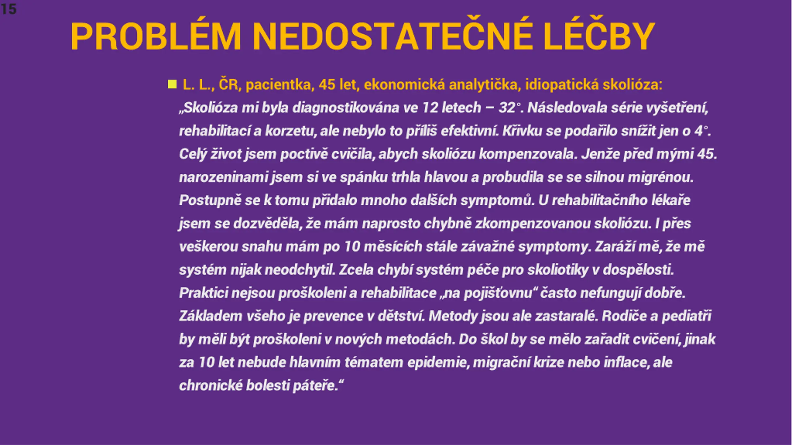 15 PROBL M NEDOSTATE N L BY L. L., R, pacientka, 45 let, ekonomick analyti ka, idiopatick skoli za: Skoli za mi byla diagnostikov na ve 12 letech 32 . N sledovala s rie vy et en , rehabilitac a korzetu, ale nebylo to p li efektivn . K ivku se poda ilo sn it jen o 4 . Cel ivot jsem poctiv cvi ila, abych skoli zu kompenzovala. Jen e p ed m mi 45. narozeninami jsem si ve sp nku trhla hlavou a probudila se se silnou migr nou. Postupn se k tomu p idalo mnoho dal ch symptom . U rehabilita n ho l ka e jsem se dozv d la, e m m naprosto chybn zkompenzovanou skoli zu. I p es ve kerou snahu m m po 10 m s c ch st le z va n symptomy. Zar m , e m syst m nijak neodchytil. Zcela chyb syst m p e pro skoliotiky v dosp losti. Praktici nejsou pro koleni a rehabilitace na poji ovnu asto nefunguj dob e. Z kladem v eho je prevence v d tstv . Metody jsou ale zastaral . Rodi e a pediat i by m li b t pro koleni v nov ch metod ch. Do kol by se m lo za adit cvi en , jinak za 10 let nebude hlavn m t matem epidemie, migra n krize nebo inflace, ale chronick bolesti p te e.