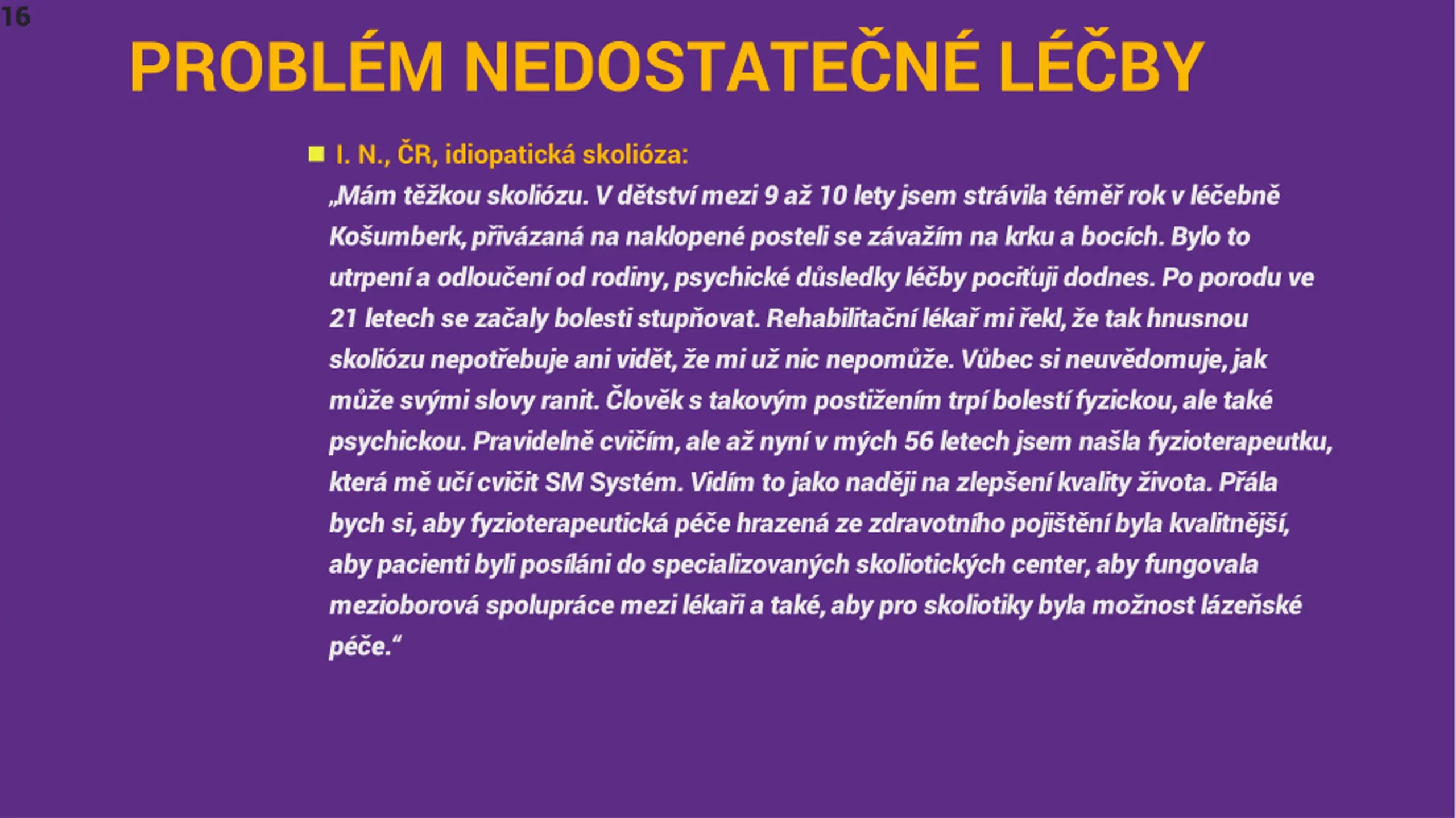 16 PROBL M NEDOSTATE N L BY I. N., R, idiopatick skoli za: M m t kou skoli zu. V d tstv mezi 9 a 10 lety jsem str vila t m rok v l ebn Ko umberk, p iv zan na naklopen posteli se z va m na krku a boc ch. Bylo to utrpen a odlou en od rodiny, psychick d sledky l by poci uji dodnes. Po porodu ve 21 letech se za aly bolesti stup ovat. Rehabilita n l ka mi ekl, e tak hnusnou skoli zu nepot ebuje ani vid t, e mi u nic nepom e. V bec si neuv domuje, jak m e sv mi slovy ranit. lov k s takov m posti en m trp bolest fyzickou, ale tak psychickou. Pravideln cvi m, ale a nyn v m ch 56 letech jsem na la fyzioterapeutku, kter m u cvi it SM Syst m. Vid m to jako nad ji na zlep en kvality ivota. P la bych si, aby fyzioterapeutick p e hrazen ze zdravotn ho poji t n byla kvalitn j , aby pacienti byli pos l ni do specializovan ch skoliotick ch center, aby fungovala mezioborov spolupr ce mezi l ka i a tak , aby pro skoliotiky byla mo nost l ze sk p e.