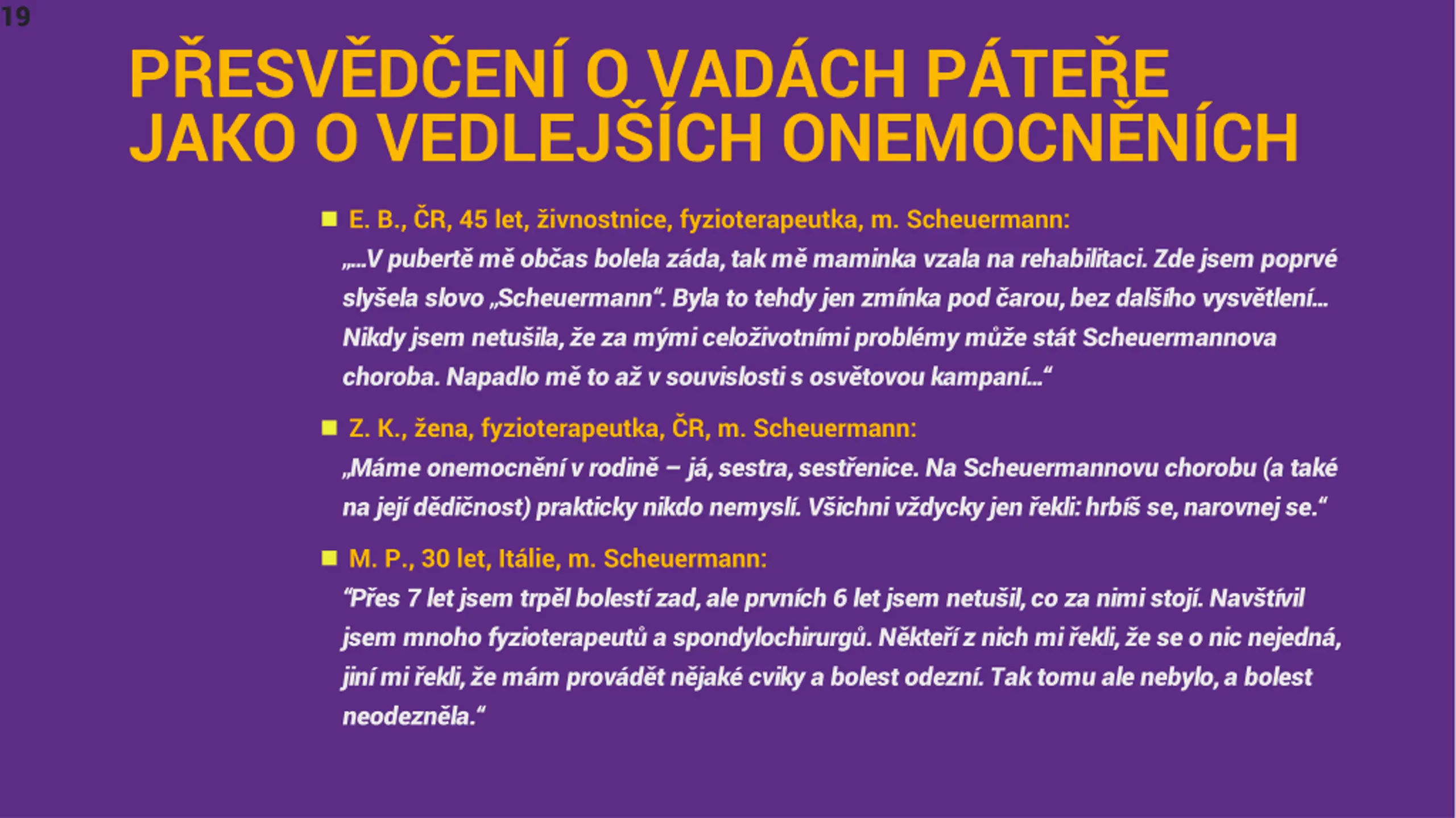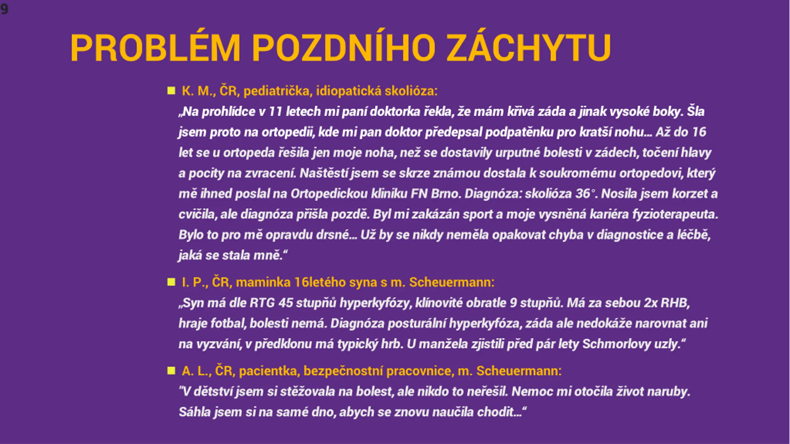 11 PROBL M POZDN HO Z CHYTU Maminka hovo o 16let dce i s m. Scheuermann, Slovensko: Od 11 rokov sme s dc rou cvi ili na skoli zu. Nezlep ovalo sa to. Nav t vili sme postupne troch pecialistov. A tvrt pecialista n m povedal, e vtedy 16-ro n dc ra m Scheuermannovu kyf zu, ak e te nikdy nevidel, a e mus ihne na oper ciu. Bol ve mi na tvan a nech pal, e to mohli predch dzaj ci pecialisti min Z. J., pacientka, 30 let, design rka a v decko-v zkumn pracovnice, m. Scheuermann: Scheuermann jde v na rodin v ensk rodov linii. Od 13 let jsem trp la bolestmi zad a chodila po doktorech, ale nemoc mi byla diagnostikov na a ve 21 letech. Za posledn ch p r let jsem sly ela vy jste t k degenerace, to jsem je t nevid l takovou p te u takhle mlad ho lov ka , nebo naopak blackdiscs m spoustu lid , to v bec ne e te . Probl m je, e u eny Scheuermanna nikdo ne ek . V u ebnic ch je uv d n jako nemoc mu . Vede k n zk kvalit ivota, je zdrojem velk nejistoty, nap . v oblasti t hotenstv , a vytv velk n por na psychiku. J. P., pacient, 42 let, m. Scheuermann: M l by b t v t d raz na zachycen nemoci v ran m v ku, a v asn zah jen intenzivn l by (zejm na c len rehabilitace). S Morbus Scheuermann trp m od 13 let. V ml d p te nebolela, nebyl to probl m. Nyn v dosp losti trp m chronick mi bolestmi. Rehabilitace pom h pouze kr tkodob .
