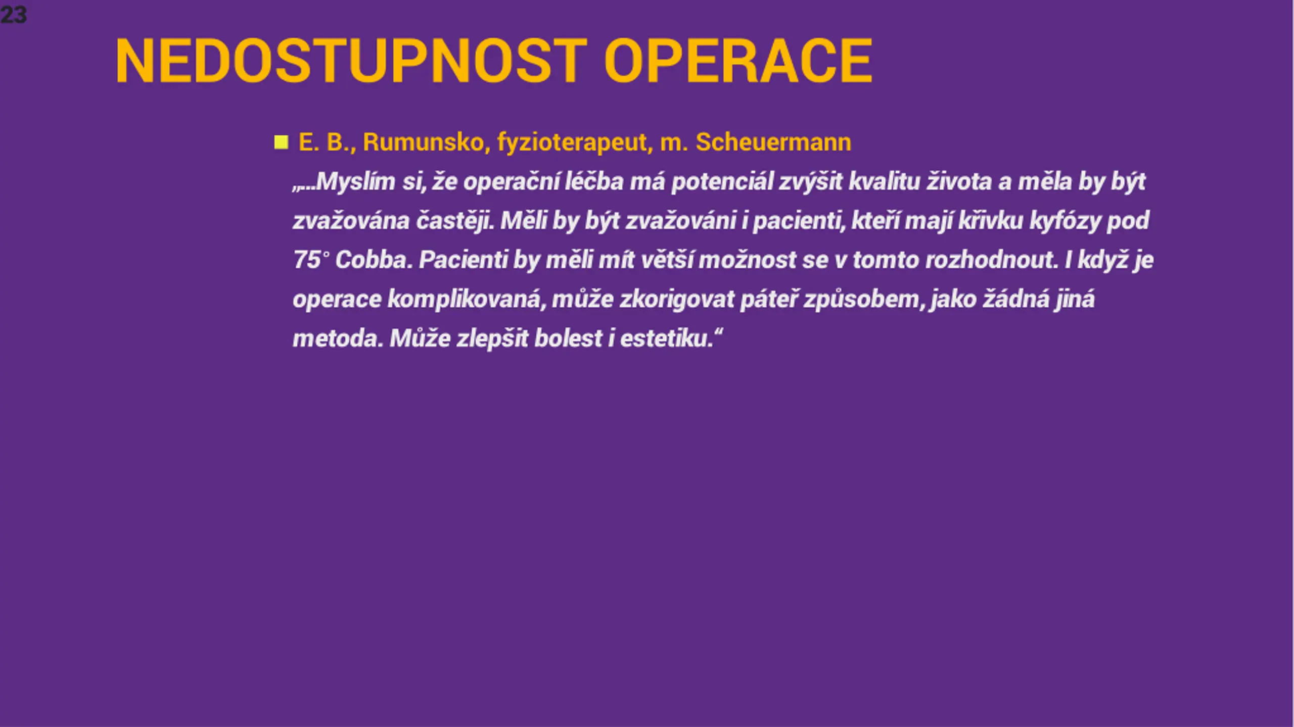 23 NEDOSTUPNOST OPERACE E. B., Rumunsko, fyzioterapeut, m. Scheuermann Mysl m si, e opera n l ba m potenci l zv it kvalitu ivota a m la by b t zva ov na ast ji. M li by b t zva ov ni i pacienti, kte maj k ivku kyf zy pod 75 Cobba. Pacienti by m li m t v t mo nost se v tomto rozhodnout. I kdy je operace komplikovan , m e zkorigovat p te zp sobem, jako dn jin metoda. M e zlep it bolest i estetiku.