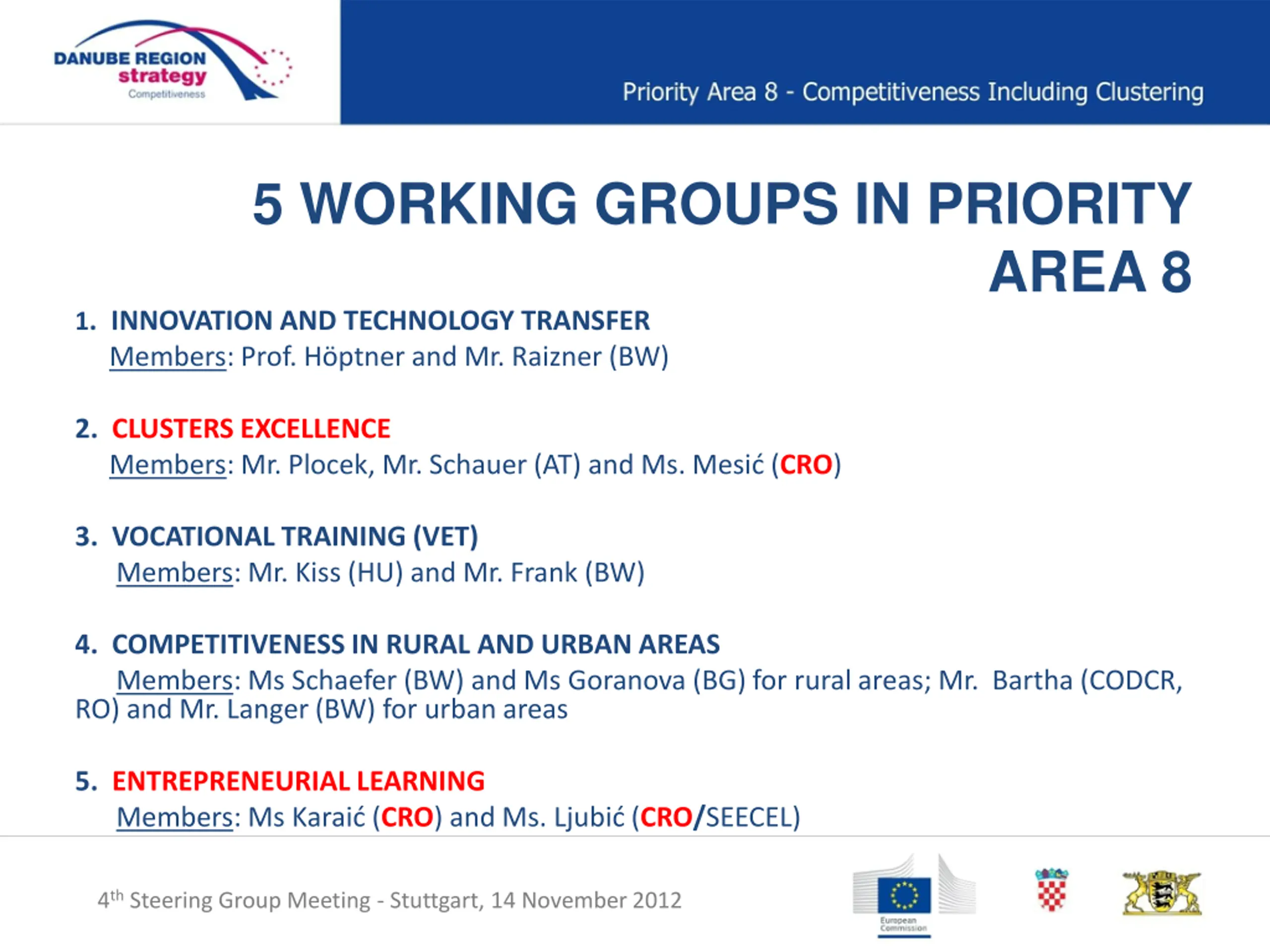 5 WORKING GROUPS IN PRIORITY AREA 8 1. INNOVATION AND TECHNOLOGY TRANSFER Members: Prof. H ptner and Mr. Raizner (BW) 2. CLUSTERS EXCELLENCE Members: Mr. Plocek, Mr. Schauer (AT) and Ms. Mesi (CRO) 3. VOCATIONAL TRAINING (VET) Members: Mr. Kiss (HU) and Mr. Frank (BW) 4. COMPETITIVENESS IN RURAL AND URBAN AREAS Members: Ms Schaefer (BW) and Ms Goranova (BG) for rural areas; Mr. Bartha (CODCR, RO) and Mr. Langer (BW) for urban areas 5. ENTREPRENEURIAL LEARNING Members: Ms Karai (CRO) and Ms. Ljubi (CRO/SEECEL) 4thSteering Group Meeting - Stuttgart, 14 November 2012