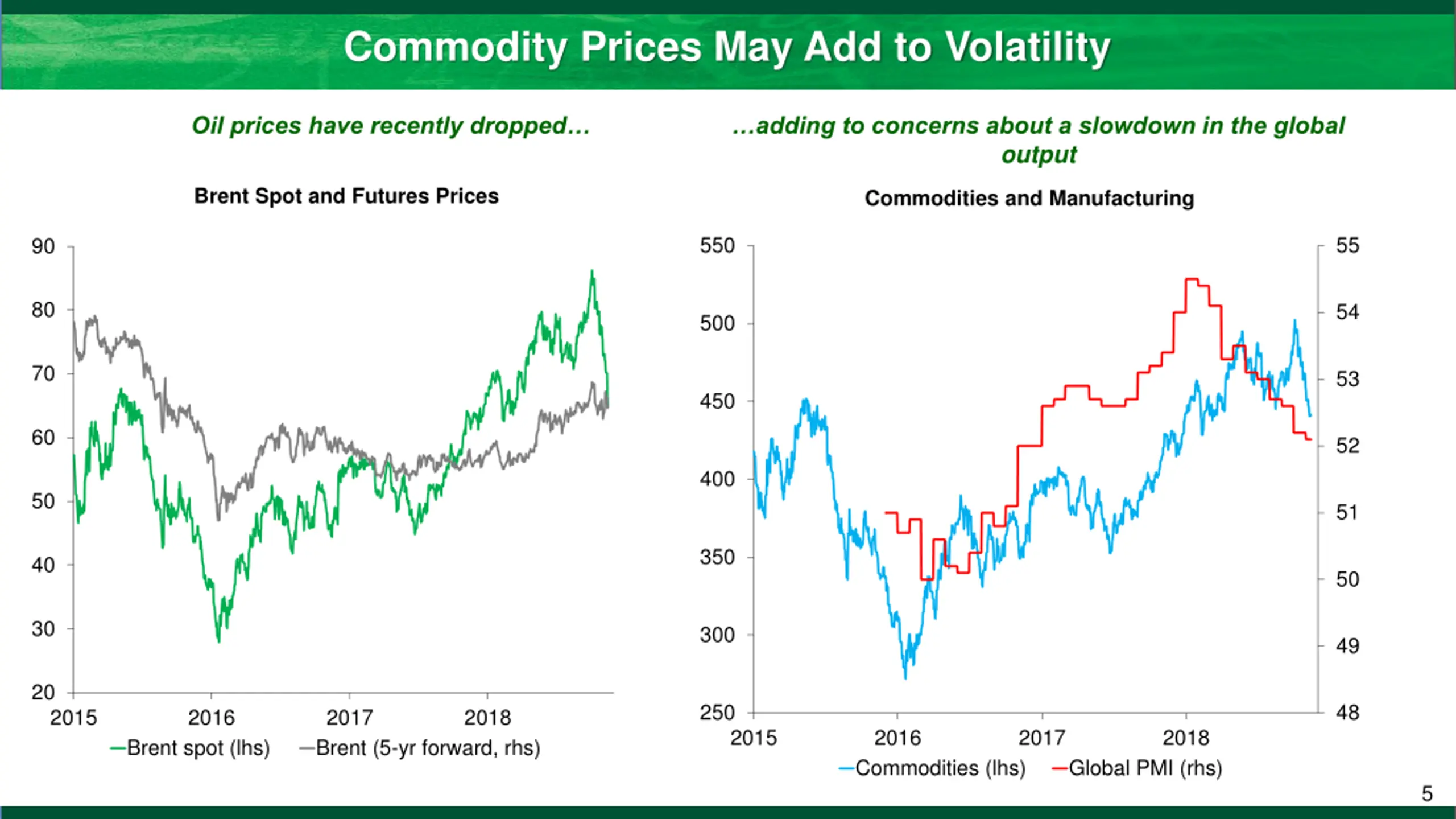 Commodity Prices May Add to Volatility Oil prices have recently dropped adding to concerns about a slowdown in the global output Brent Spot and Futures Prices Commodities and Manufacturing 550 55 90 80 54 500 70 53 450 60 52 400 50 51 350 40 50 30 300 49 20 250 48 2015 2016 2017 Brent (5-yr forward, rhs) 2018 2015 2016 Commodities (lhs) 2017 2018 Brent spot (lhs) Global PMI (rhs) 5