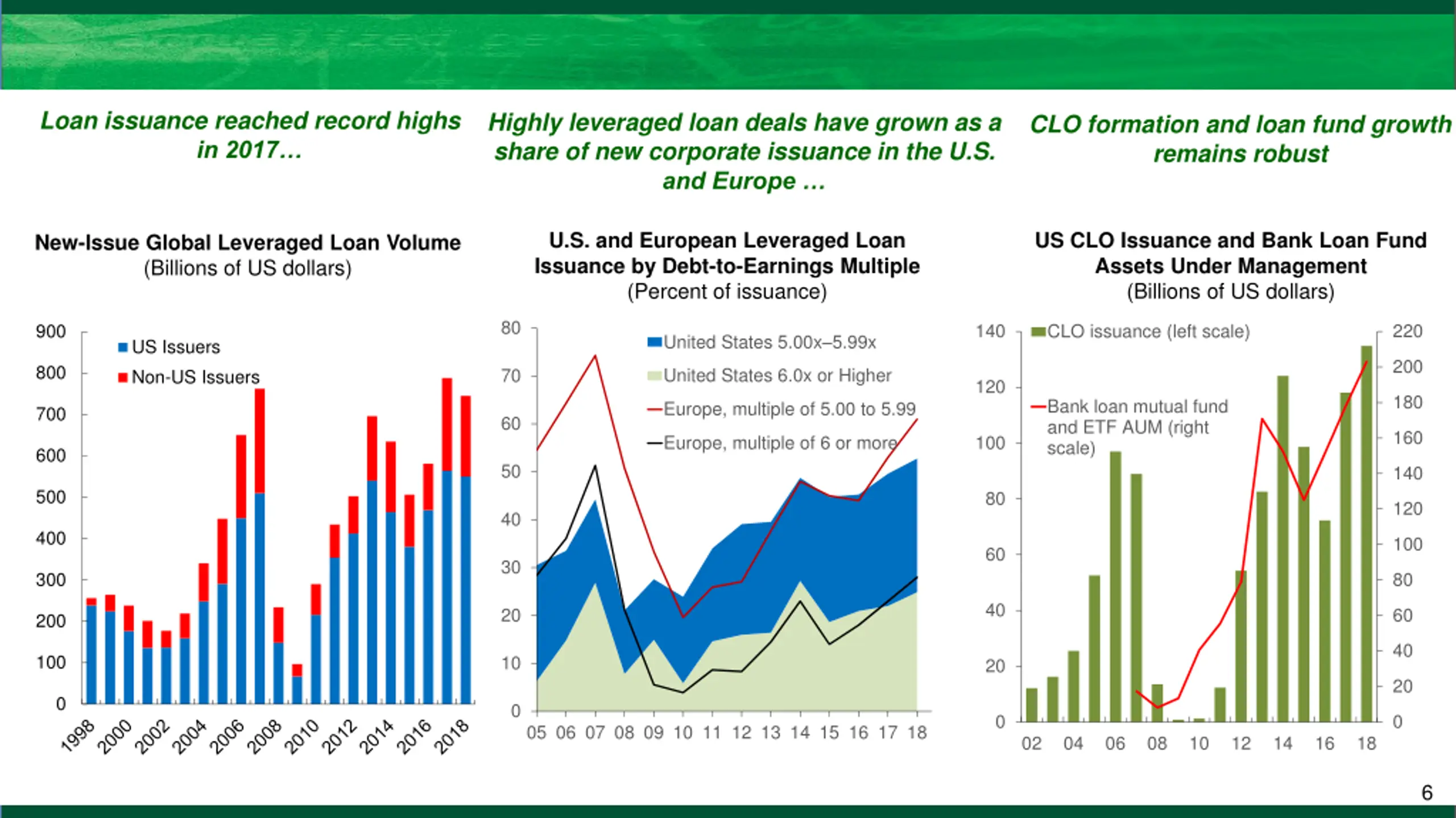 Loan issuance reached record highs in 2017 Highly leveraged loan deals have grown as a share of new corporate issuance in the U.S. and Europe CLO formation and loan fund growth remains robust U.S. and European Leveraged Loan Issuance by Debt-to-Earnings Multiple (Percent of issuance) US CLO Issuance and Bank Loan Fund Assets Under Management (Billions of US dollars) New-Issue Global Leveraged Loan Volume (Billions of US dollars) 80 140 220 900 CLO issuance (left scale) United States 5.00x 5.99x US Issuers Non-US Issuers 200 800 United States 6.0x or Higher 70 120 180 Bank loan mutual fund and ETF AUM (right scale) Europe, multiple of 5.00 to 5.99 700 60 160 100 Europe, multiple of 6 or more 600 50 140 500 80 120 40 400 100 60 30 300 80 40 20 60 200 40 100 10 20 20 0 0 0 0 05 06 07 08 09 10 11 12 13 14 15 16 17 18 02 04 06 08 10 12 14 16 18 6