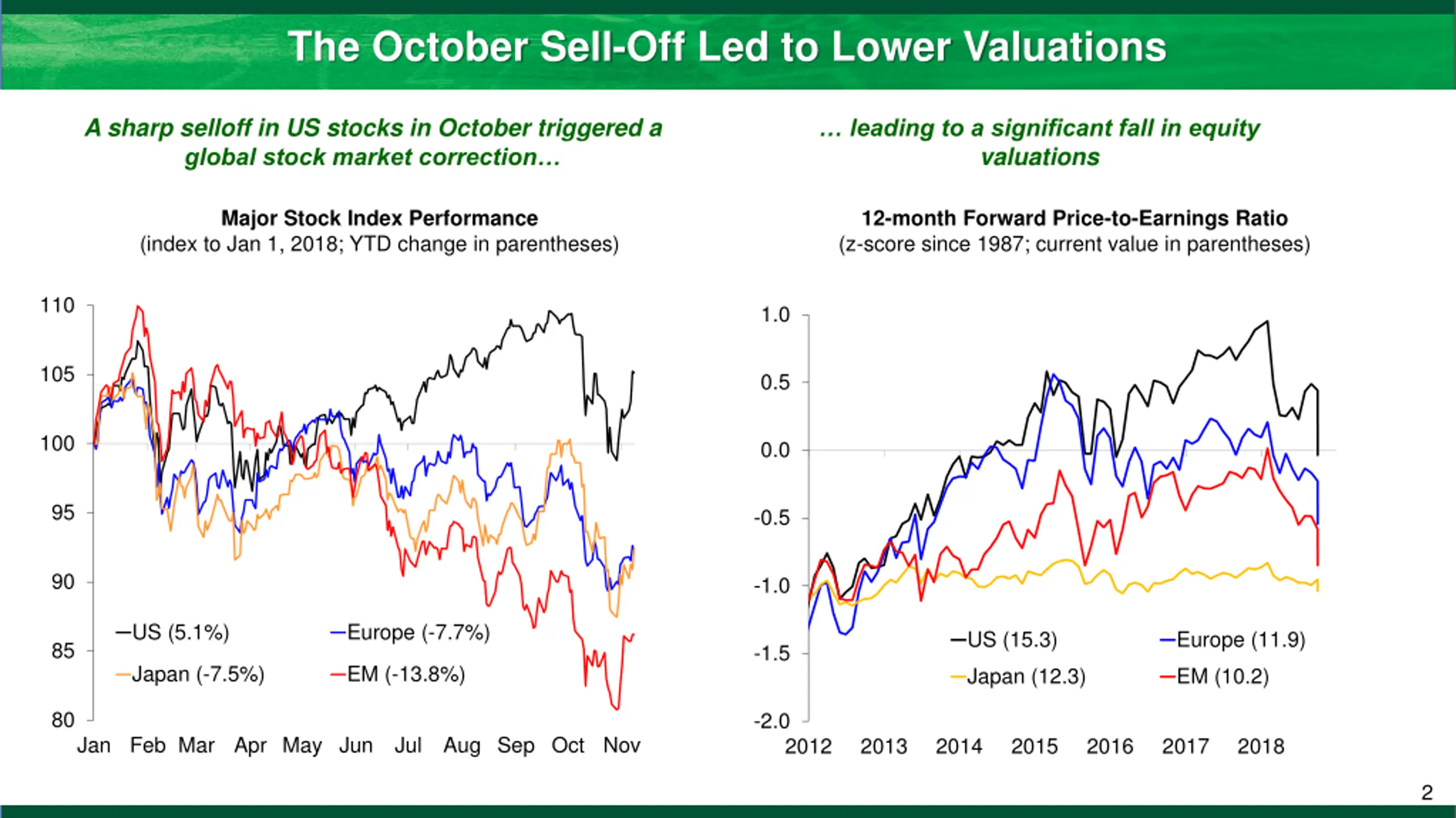 The October Sell-Off Led to Lower Valuations A sharp selloff in US stocks in October triggered a global stock market correction leading to a significant fall in equity valuations Major Stock Index Performance (index to Jan 1, 2018; YTD change in parentheses) 12-month Forward Price-to-Earnings Ratio (z-score since 1987; current value in parentheses) 110 1.0 105 0.5 100 0.0 95 -0.5 90 -1.0 US (5.1%) Europe (-7.7%) US (15.3) Europe (11.9) 85 -1.5 Japan (-7.5%) EM (-13.8%) Japan (12.3) EM (10.2) 80 -2.0 Jan Feb Mar Apr May Jun Jul Aug Sep Oct Nov 2012 2013 2014 2015 2016 2017 2018 2