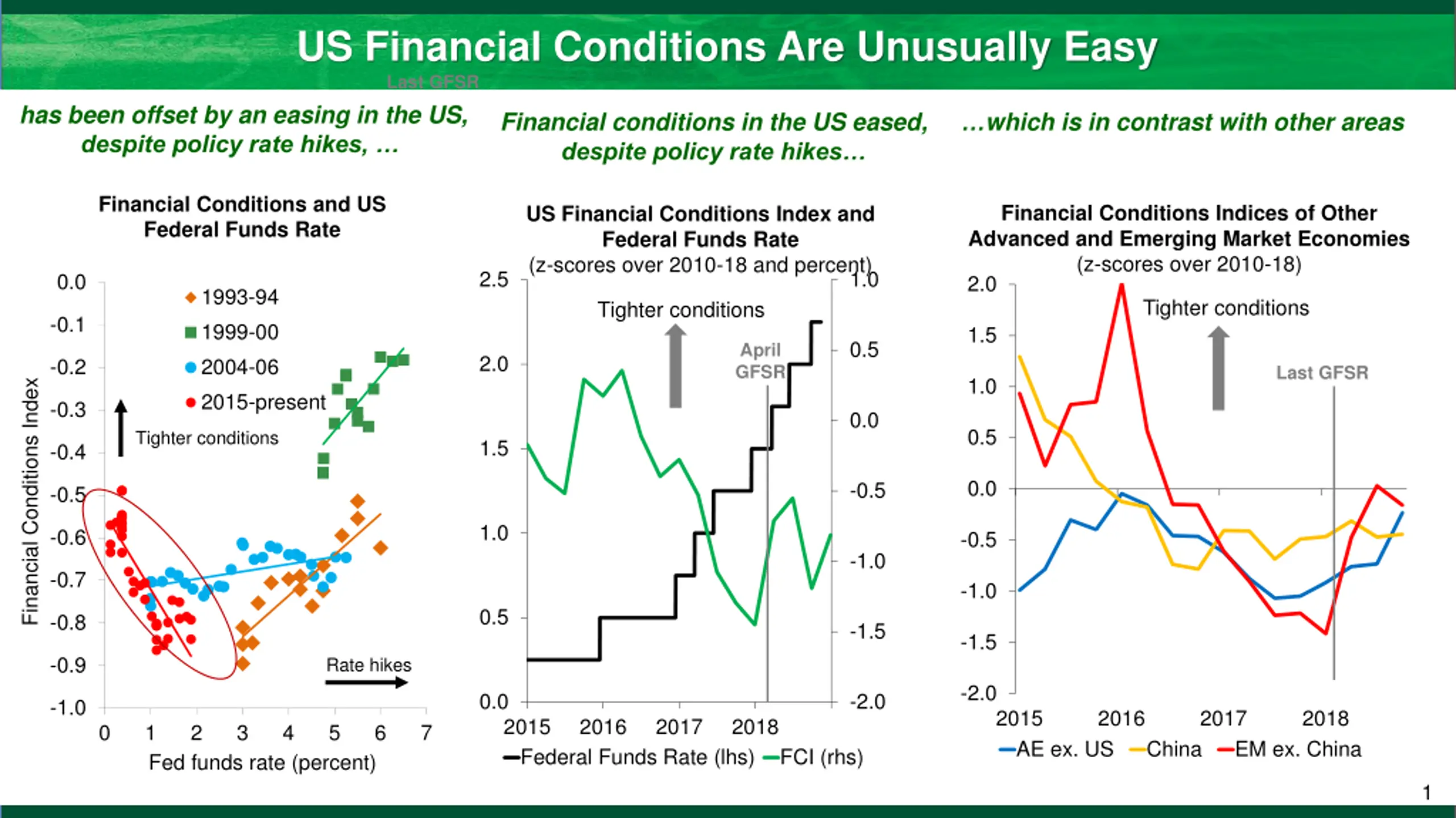 US Financial Conditions Are Unusually Easy Last GFSR has been offset by an easing in the US, despite policy rate hikes, Financial conditions in the US eased, despite policy rate hikes which is in contrast with other areas Financial Conditions and US Federal Funds Rate Financial Conditions Indices of Other Advanced and Emerging Market Economies (z-scores over 2010-18) 2.0 Tighter conditions US Financial Conditions Index and Federal Funds Rate (z-scores over 2010-18 and percent) 2.5 1.0 0.0 1993-94 1999-00 2004-06 2015-present Tighter conditions Financial Conditions Index -0.1 1.5 0.5 April GFSR 2.0 -0.2 Last GFSR 1.0 -0.3 0.0 0.5 Tighter conditions 1.5 -0.4 0.0 -0.5 -0.5 1.0 -0.6 -0.5 -1.0 -0.7 -1.0 0.5 -0.8 -1.5 -1.5 -0.9 Rate hikes -2.0 0.0 -2.0 -1.0 2015 AE ex. US 2016 2017 2018 2015 Federal Funds Rate (lhs) 2016 2017 2018 0 1 Fed funds rate (percent) 2 3 4 5 6 7 China EM ex. China FCI (rhs) 1