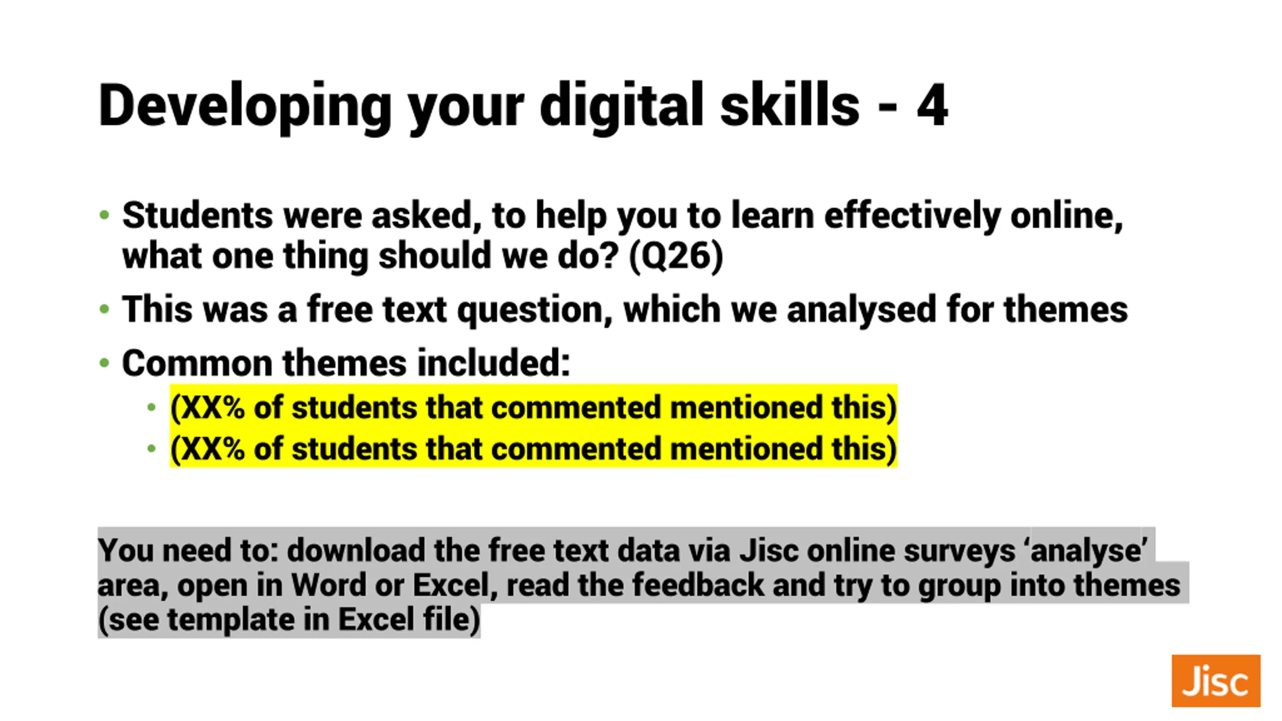 Developing your digital skills - 4 Students were asked, to help you to learn effectively online, what one thing should we do? (Q26) This was a free text question, which we analysed for themes Common themes included: (XX% of students that commented mentioned this) (XX% of students that commented mentioned this) You need to: download the free text data via Jisc online surveys analyse area, open in Word or Excel, read the feedback and try to group into themes (see template in Excel file)