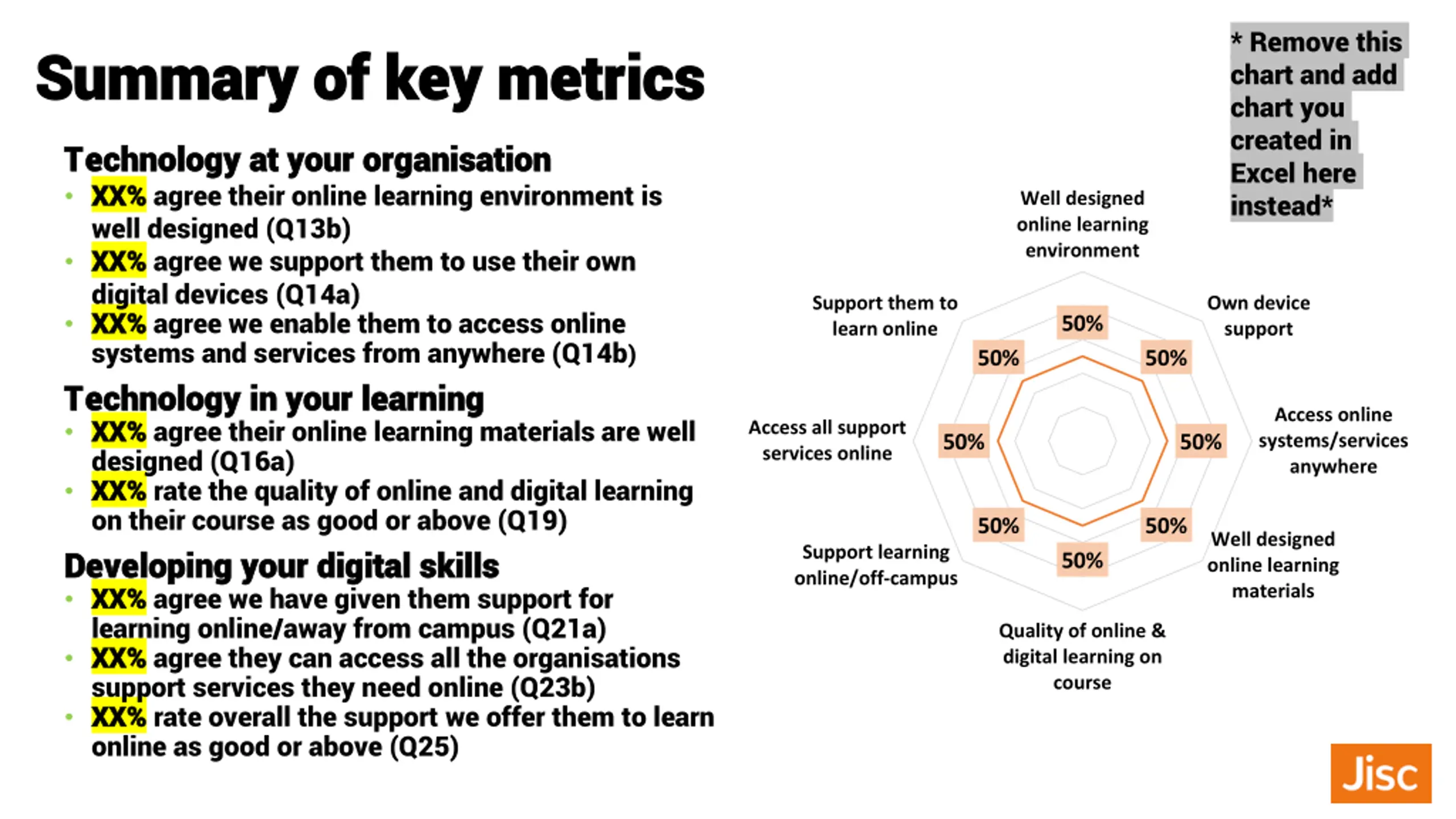 * Remove this chart and add chart you created in Excel here instead* Summary of key metrics Summary of key metrics Technology at your organisation Technology at your organisation XX% XX% agree their online learning environment is well designed (Q13b) XX% XX% agree we support them to use their own digital devices (Q14a) XX% XX% agree we enable them to access online systems and services from anywhere (Q14b) Technology in your learning Technology in your learning XX% XX% agree their online learning materials are well designed (Q16a) XX% XX% rate the quality of online and digital learning on their course as good or above (Q19) Developing your digital skills Developing your digital skills XX% XX% agree we have given them support for learning online/away from campus (Q21a) XX% XX% agree they can access all the organisations support services they need online (Q23b) XX% XX% rate overall the support we offer them to learn online as good or above (Q25) Well designed online learning environment Support them to learn online Own device support 50% 50% 50% Access online systems/services anywhere Access all support services online 50% 50% 50% 50% Well designed online learning materials Support learning online/off-campus 50% Quality of online & digital learning on course