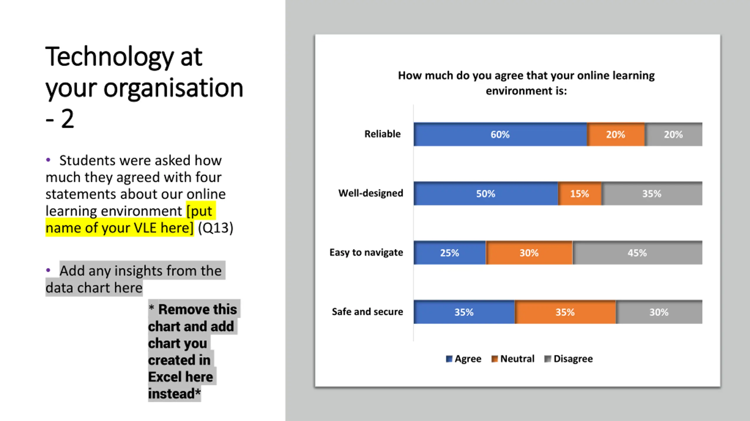 Technology at Technology at your organisation your organisation - - 2 2 How much do you agree that your online learning environment is: Reliable 60% 20% 20% Students were asked how much they agreed with four statements about our online learning environment [put name of your VLE here] (Q13) Well-designed 50% 15% 35% Easy to navigate 25% 30% 45% Add any insights from the data chart here * Remove this chart and add chart you created in Excel here instead* Safe and secure 35% 35% 30% Agree Neutral Disagree