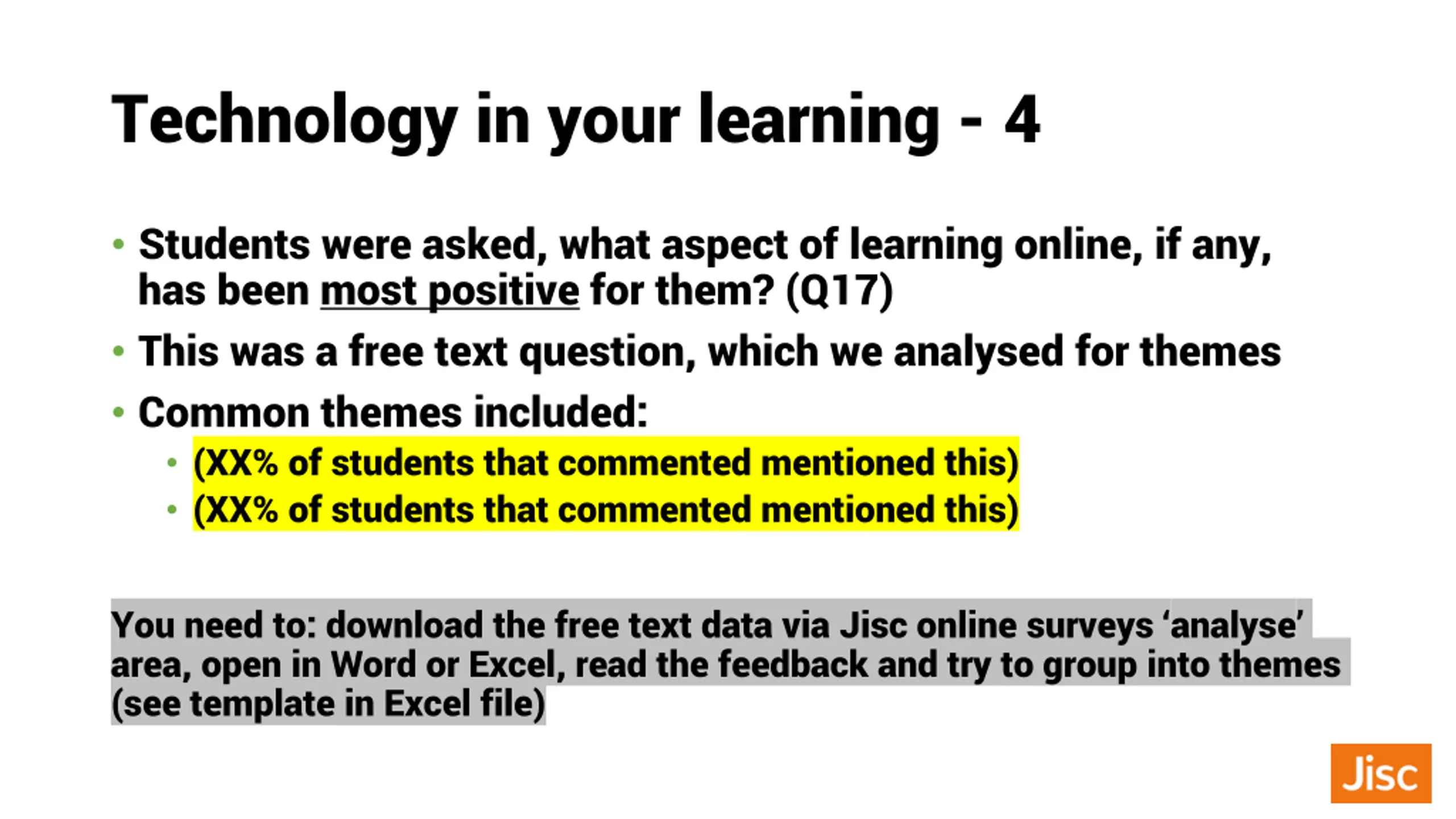 Technology in your learning - 4 Students were asked, what aspect of learning online, if any, has been most positive for them? (Q17) This was a free text question, which we analysed for themes Common themes included: (XX% of students that commented mentioned this) (XX% of students that commented mentioned this) You need to: download the free text data via Jisc online surveys analyse area, open in Word or Excel, read the feedback and try to group into themes (see template in Excel file)