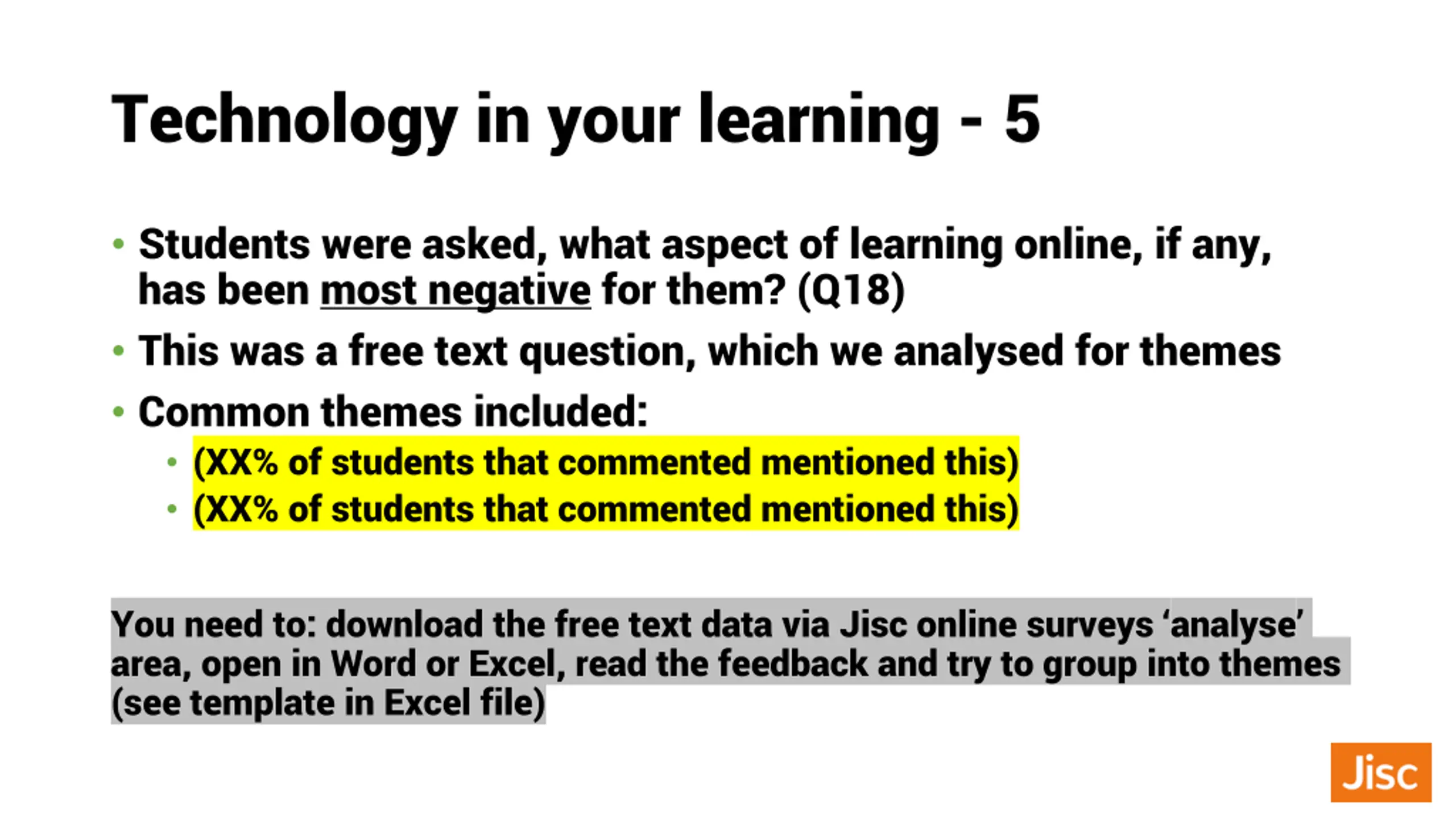 Technology in your learning - 5 Students were asked, what aspect of learning online, if any, has been most negative for them? (Q18) This was a free text question, which we analysed for themes Common themes included: (XX% of students that commented mentioned this) (XX% of students that commented mentioned this) You need to: download the free text data via Jisc online surveys analyse area, open in Word or Excel, read the feedback and try to group into themes (see template in Excel file)