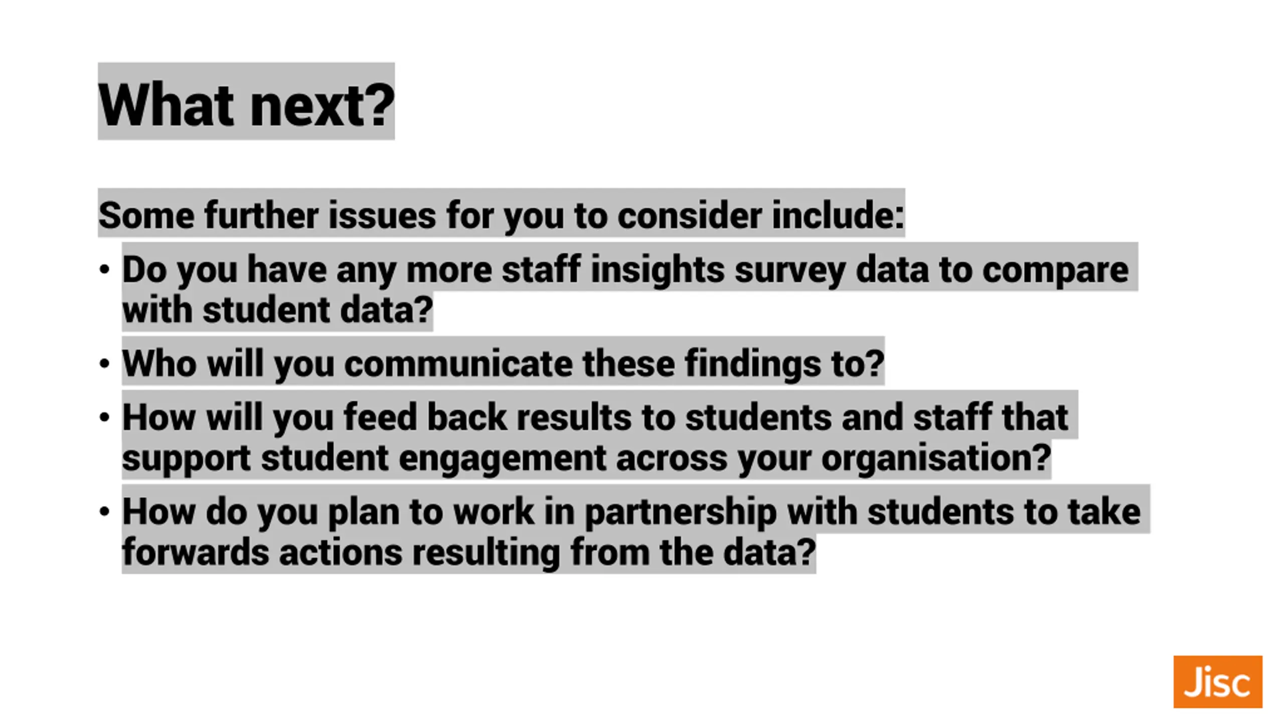 What next? Some further issues for you to consider include: Do you have any more staff insights survey data to compare with student data? Who will you communicate these findings to? How will you feed back results to students and staff that support student engagement across your organisation? How do you plan to work in partnership with students to take forwards actions resulting from the data?