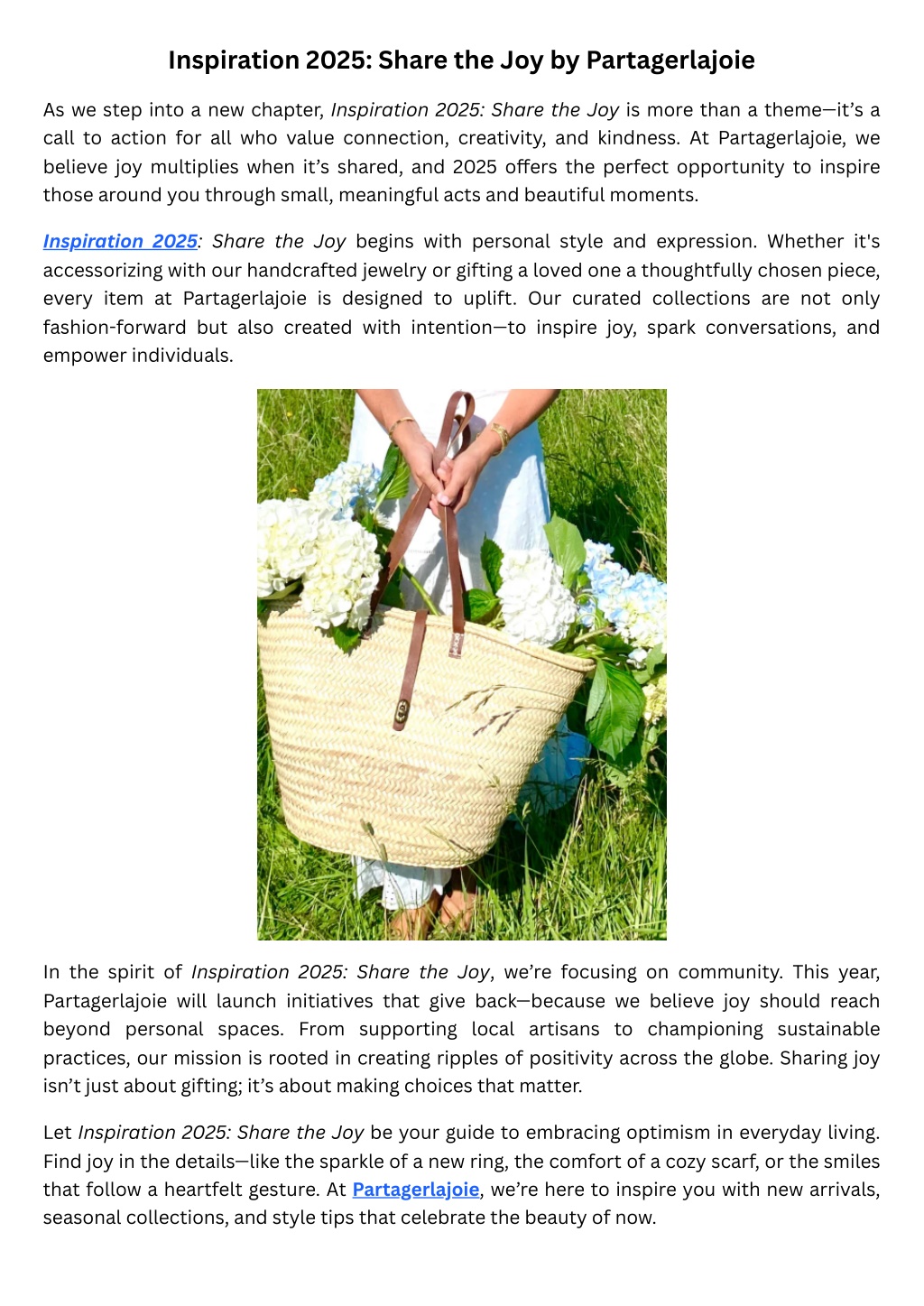 Inspiration 2025: Share the Joy by Partagerlajoie As we step into a new chapter, Inspiration 2025: Share the Joy is more than a theme it s a call to action for all who value connection, creativity, and kindness. At Partagerlajoie, we believe joy multiplies when it s shared, and 2025 o?ers the perfect opportunity to inspire those around you through small, meaningful acts and beautiful moments. Inspiration 2025: Share the Joy begins with personal style and expression. Whether it's accessorizing with our handcrafted jewelry or gifting a loved one a thoughtfully chosen piece, every item at Partagerlajoie is designed to uplift. Our curated collections are not only fashion-forward but also created with intention to inspire joy, spark conversations, and empower individuals. In the spirit of Inspiration 2025: Share the Joy, we re focusing on community. This year, Partagerlajoie will launch initiatives that give back because we believe joy should reach beyond personal spaces. From supporting local artisans to championing sustainable practices, our mission is rooted in creating ripples of positivity across the globe. Sharing joy isn t just about gifting; it s about making choices that matter. Let Inspiration 2025: Share the Joy be your guide to embracing optimism in everyday living. Find joy in the details like the sparkle of a new ring, the comfort of a cozy scarf, or the smiles that follow a heartfelt gesture. At Partagerlajoie, we re here to inspire you with new arrivals, seasonal collections, and style tips that celebrate the beauty of now.