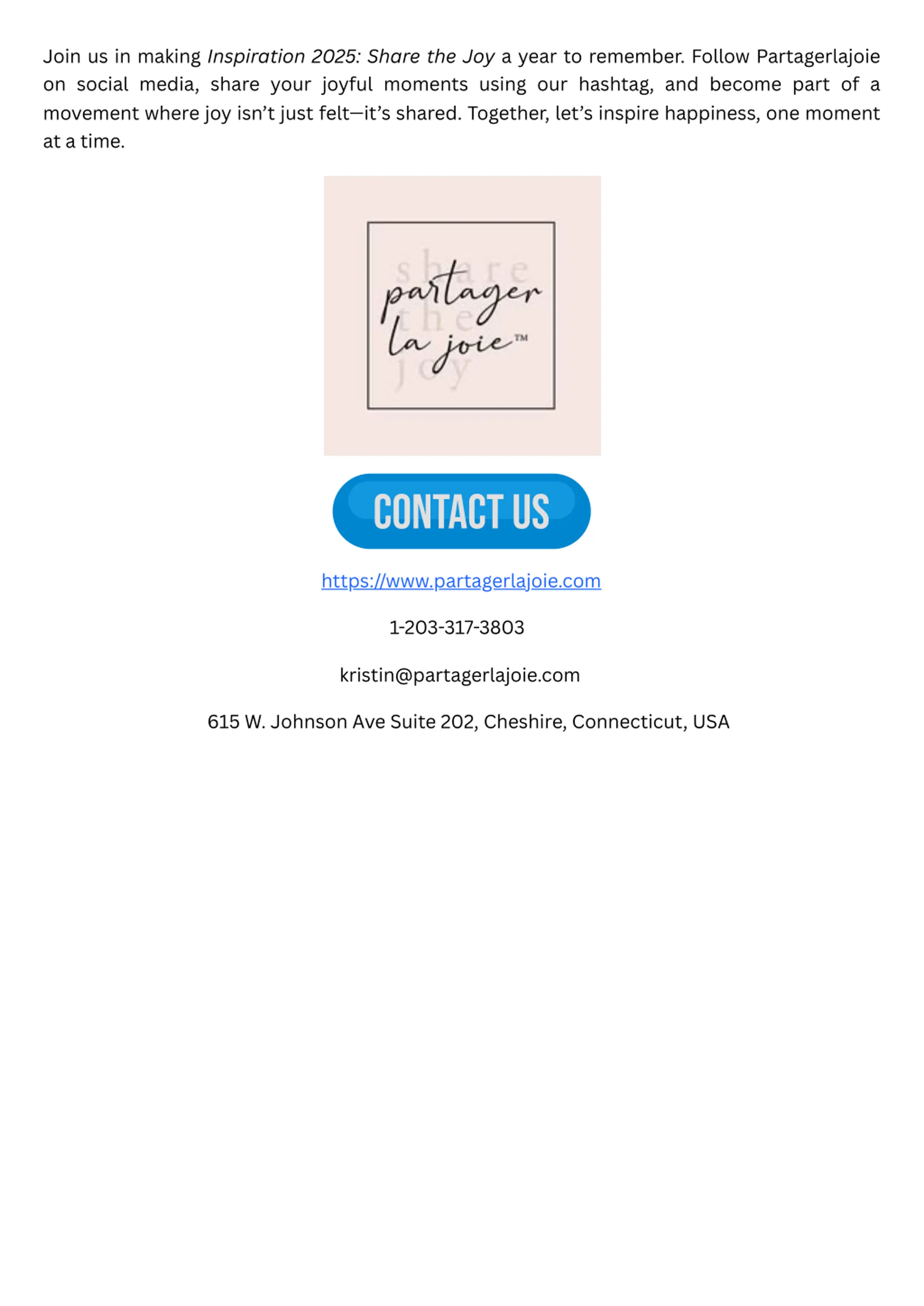 Join us in making Inspiration 2025: Share the Joy a year to remember. Follow Partagerlajoie on social media, share your joyful moments using our hashtag, and become part of a movement where joy isn t just felt it s shared. Together, let s inspire happiness, one moment at a time. https://www.partagerlajoie.com 1-203-317-3803 kristin@partagerlajoie.com 615 W. Johnson Ave Suite 202, Cheshire, Connecticut, USA
