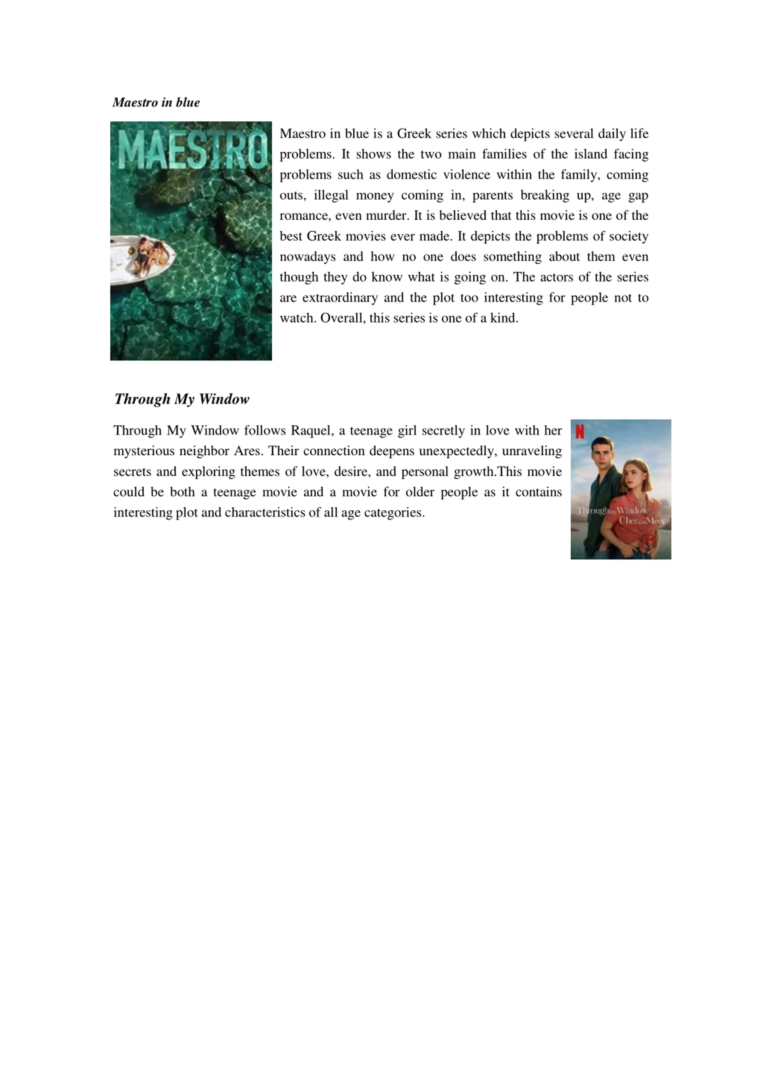 Maestro in blue Maestro in blue is a Greek series which depicts several daily life problems. It shows the two main families of the island facing problems such as domestic violence within the family, coming outs, illegal money coming in, parents breaking up, age gap romance, even murder. It is believed that this movie is one of the best Greek movies ever made. It depicts the problems of society nowadays and how no one does something about them even though they do know what is going on. The actors of the series are extraordinary and the plot too interesting for people not to watch. Overall, this series is one of a kind. Through My Window Through My Window follows Raquel, a teenage girl secretly in love with her mysterious neighbor Ares. Their connection deepens unexpectedly, unraveling secrets and exploring themes of love, desire, and personal growth.This movie could be both a teenage movie and a movie for older people as it contains interesting plot and characteristics of all age categories.