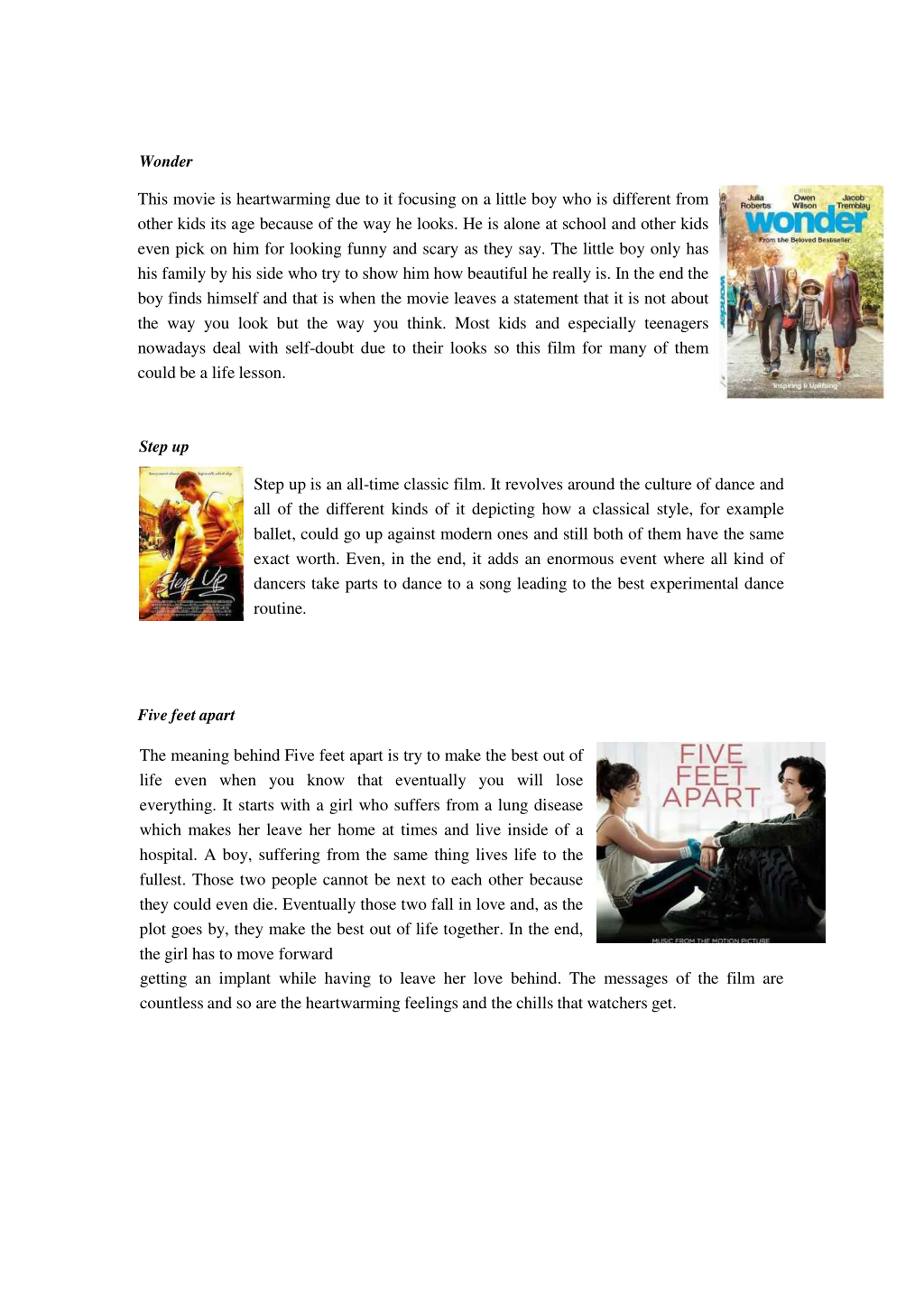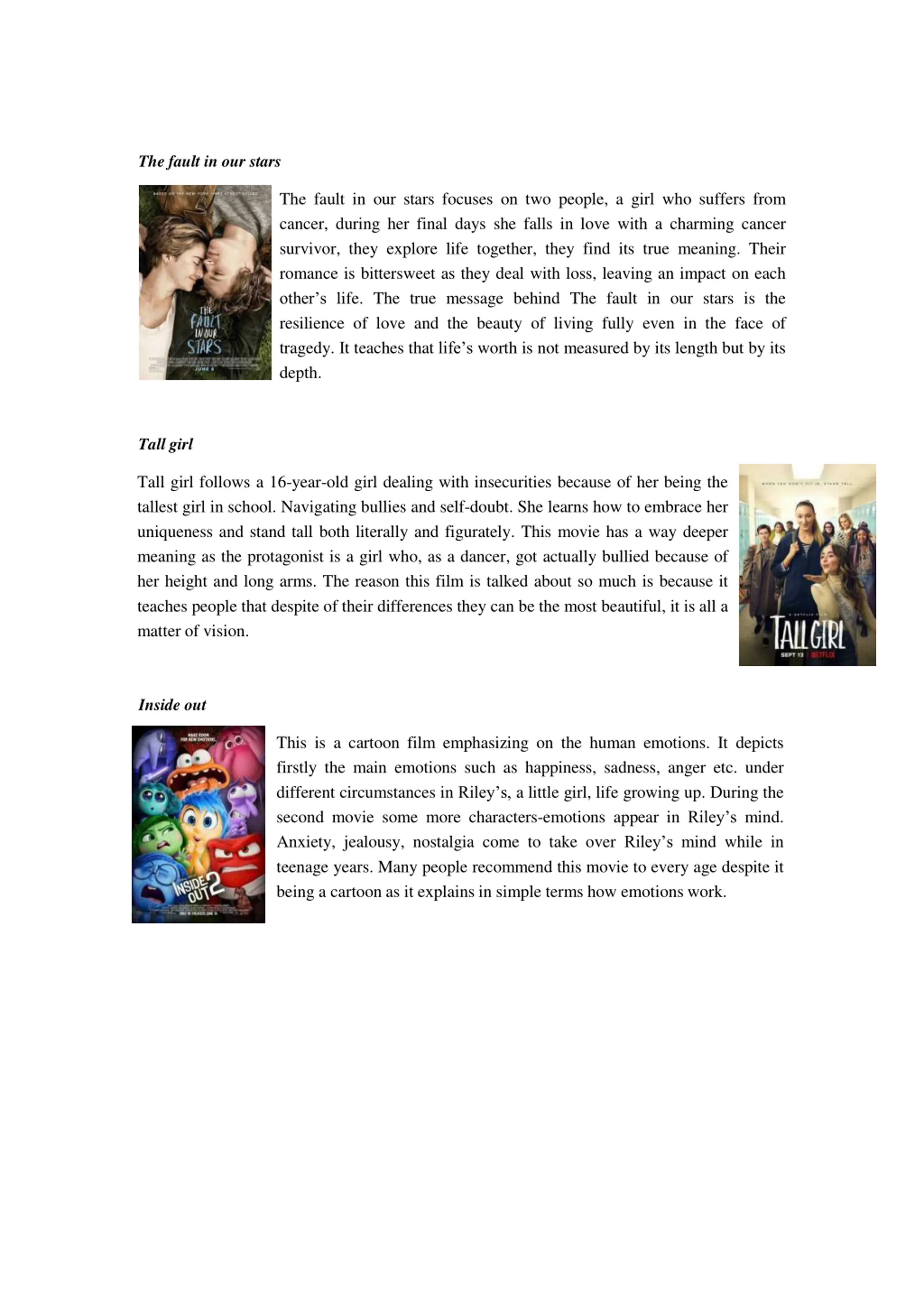 The fault in our stars The fault in our stars focuses on two people, a girl who suffers from cancer, during her final days she falls in love with a charming cancer survivor, they explore life together, they find its true meaning. Their romance is bittersweet as they deal with loss, leaving an impact on each other s life. The true message behind The fault in our stars is the resilience of love and the beauty of living fully even in the face of tragedy. It teaches that life s worth is not measured by its length but by its depth. Tall girl Tall girl follows a 16-year-old girl dealing with insecurities because of her being the tallest girl in school. Navigating bullies and self-doubt. She learns how to embrace her uniqueness and stand tall both literally and figurately. This movie has a way deeper meaning as the protagonist is a girl who, as a dancer, got actually bullied because of her height and long arms. The reason this film is talked about so much is because it teaches people that despite of their differences they can be the most beautiful, it is all a matter of vision. Inside out This is a cartoon film emphasizing on the human emotions. It depicts firstly the main emotions such as happiness, sadness, anger etc. under different circumstances in Riley s, a little girl, life growing up. During the second movie some more characters-emotions appear in Riley s mind. Anxiety, jealousy, nostalgia come to take over Riley s mind while in teenage years. Many people recommend this movie to every age despite it being a cartoon as it explains in simple terms how emotions work.