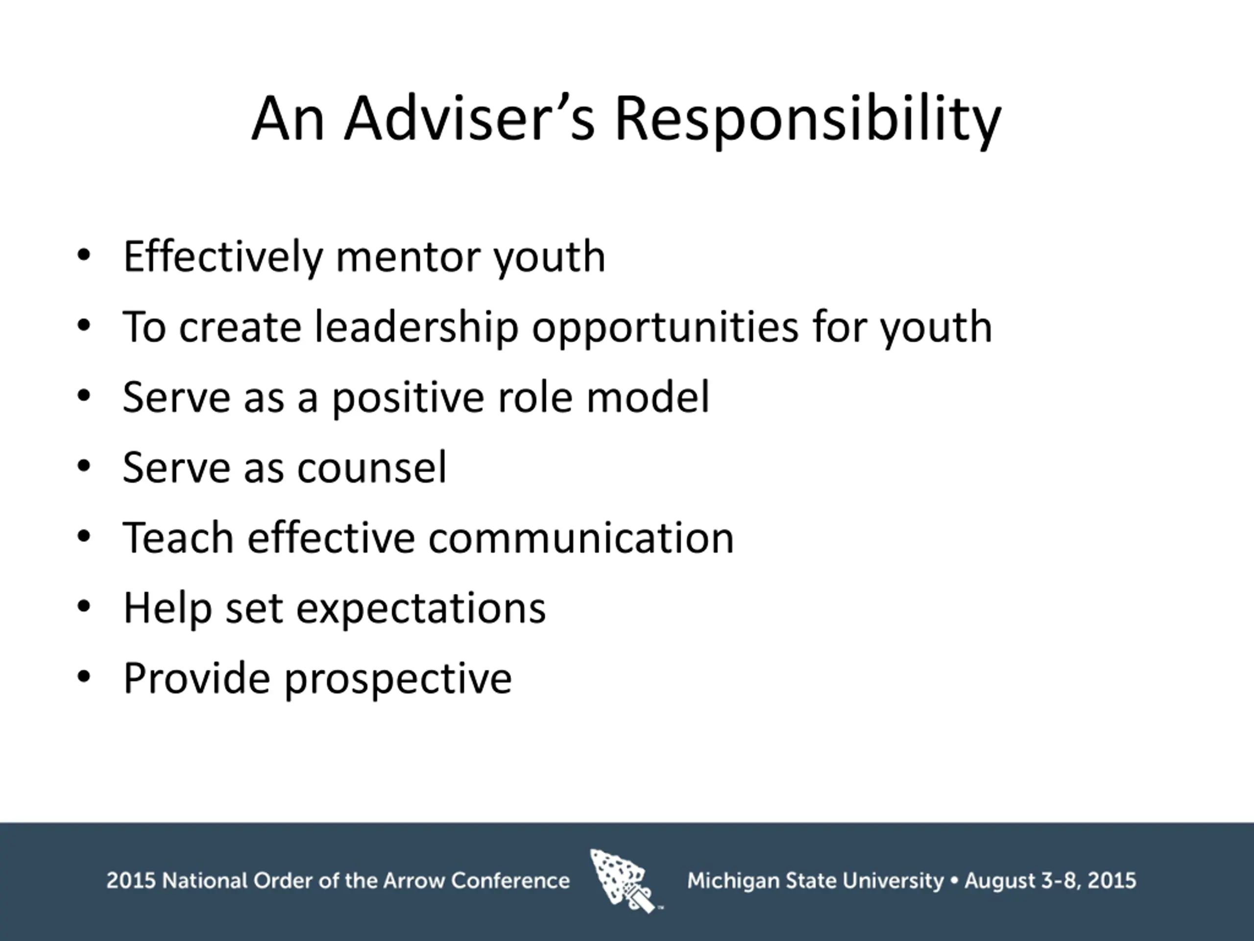 An Advisers Responsibility Effectively mentor youth To create leadership opportunities for youth Serve as a positive role model Serve as counsel Teach effective communication Help set expectations Provide prospective