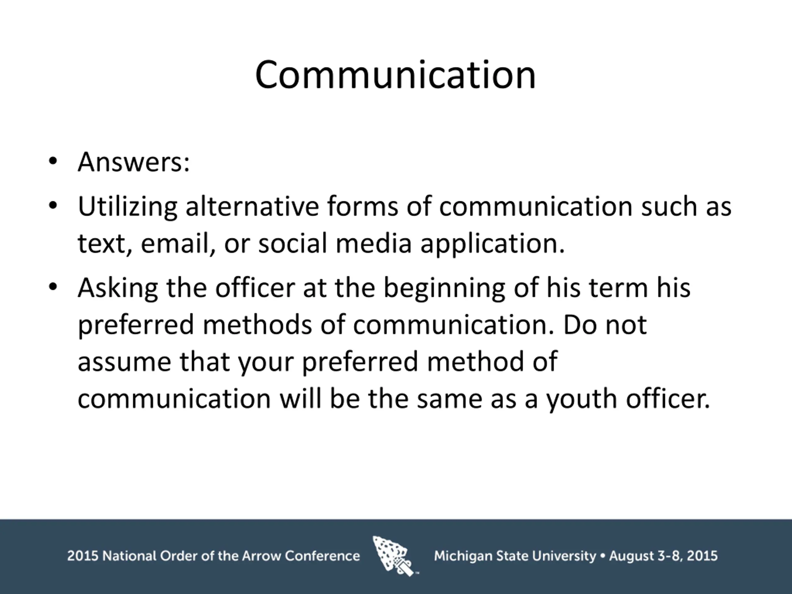 Communication Answers: Utilizing alternative forms of communication such as text, email, or social media application. Asking the officer at the beginning of his term his preferred methods of communication. Do not assume that your preferred method of communication will be the same as a youth officer.
