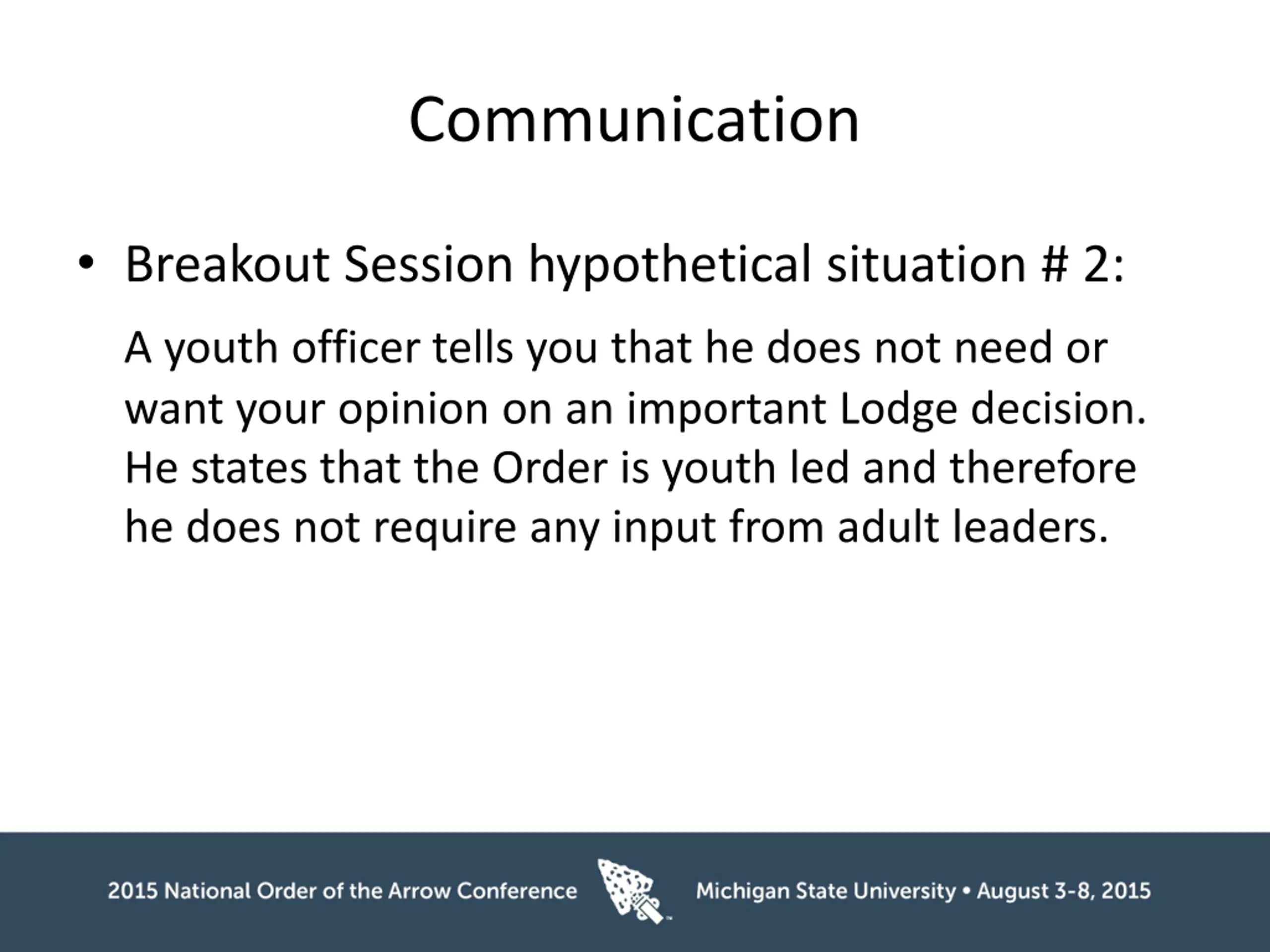 Communication Breakout Session hypothetical situation # 2: A youth officer tells you that he does not need or want your opinion on an important Lodge decision. He states that the Order is youth led and therefore he does not require any input from adult leaders.