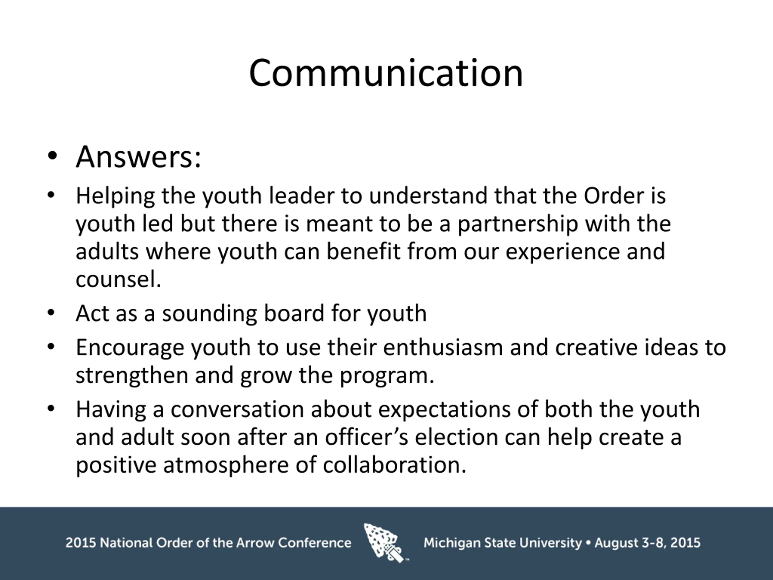 Communication Answers: Helping the youth leader to understand that the Order is youth led but there is meant to be a partnership with the adults where youth can benefit from our experience and counsel. Act as a sounding board for youth Encourage youth to use their enthusiasm and creative ideas to strengthen and grow the program. Having a conversation about expectations of both the youth and adult soon after an officer s election can help create a positive atmosphere of collaboration.