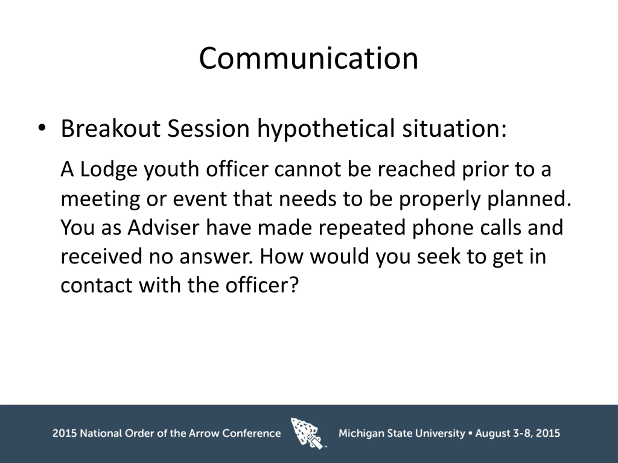 Communication Breakout Session hypothetical situation: A Lodge youth officer cannot be reached prior to a meeting or event that needs to be properly planned. You as Adviser have made repeated phone calls and received no answer. How would you seek to get in contact with the officer?