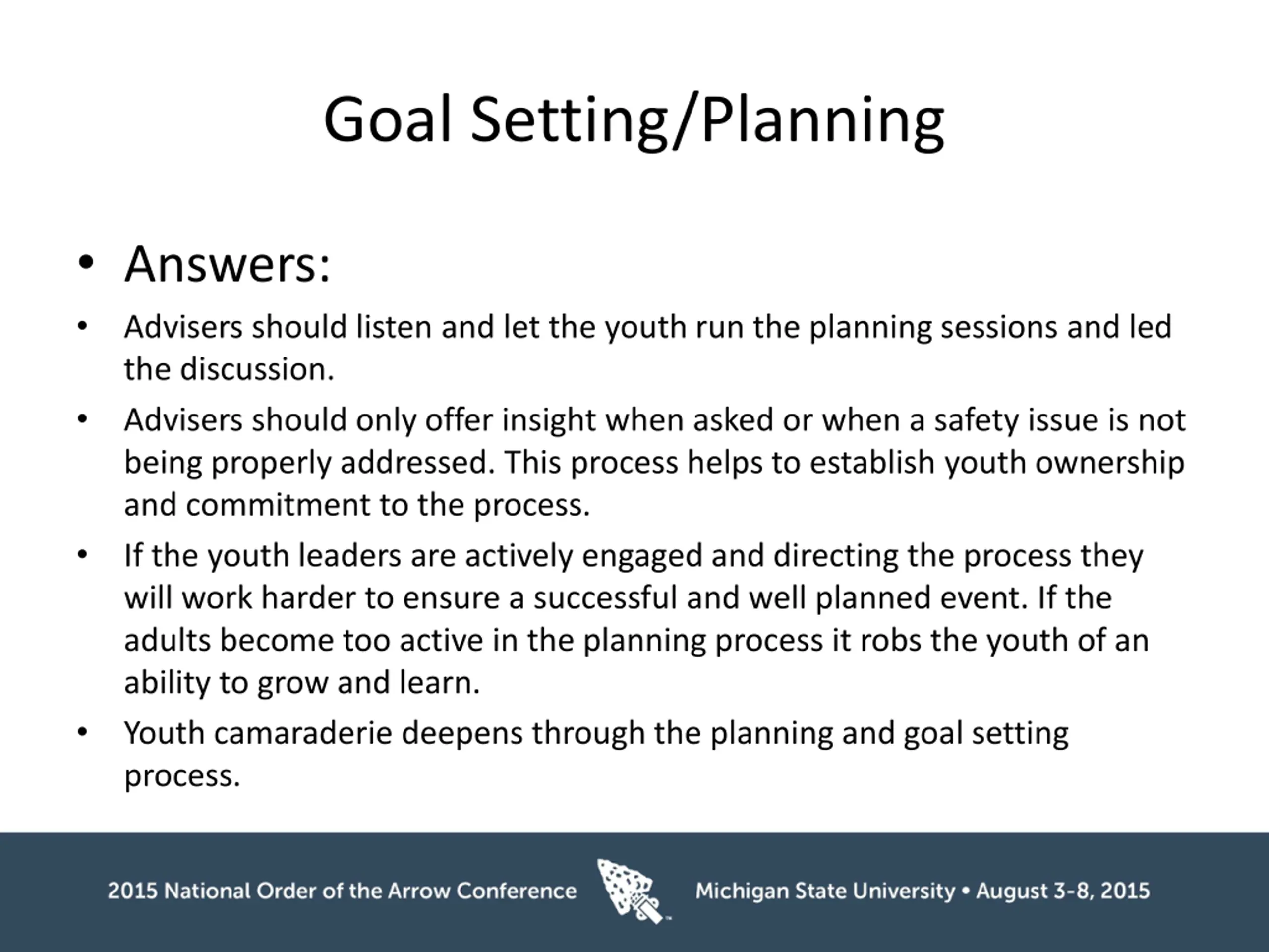 Goal Setting/Planning Answers: Advisers should listen and let the youth run the planning sessions and led the discussion. Advisers should only offer insight when asked or when a safety issue is not being properly addressed. This process helps to establish youth ownership and commitment to the process. If the youth leaders are actively engaged and directing the process they will work harder to ensure a successful and well planned event. If the adults become too active in the planning process it robs the youth of an ability to grow and learn. Youth camaraderie deepens through the planning and goal setting process.