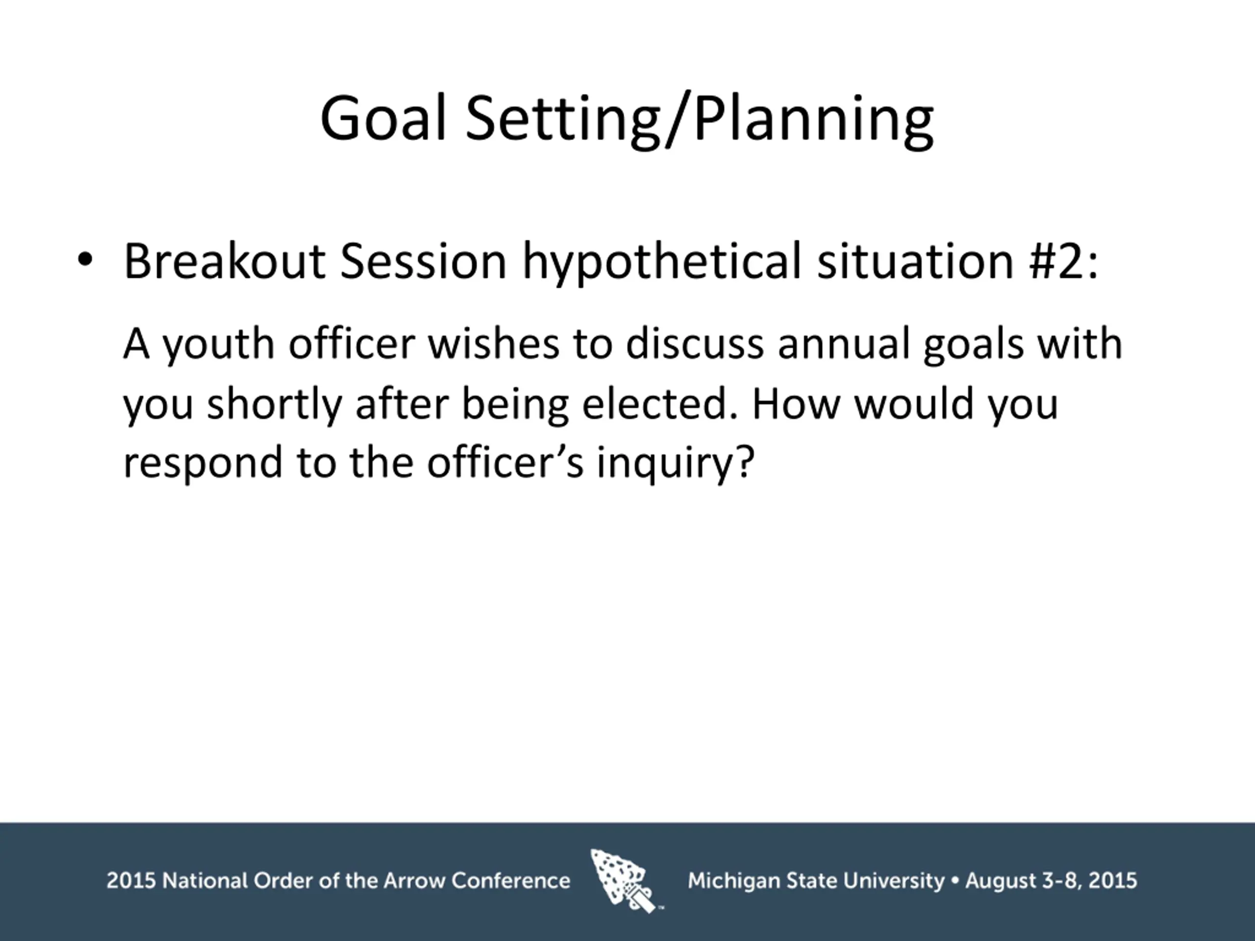 Goal Setting/Planning Breakout Session hypothetical situation #2: A youth officer wishes to discuss annual goals with you shortly after being elected. How would you respond to the officer s inquiry?
