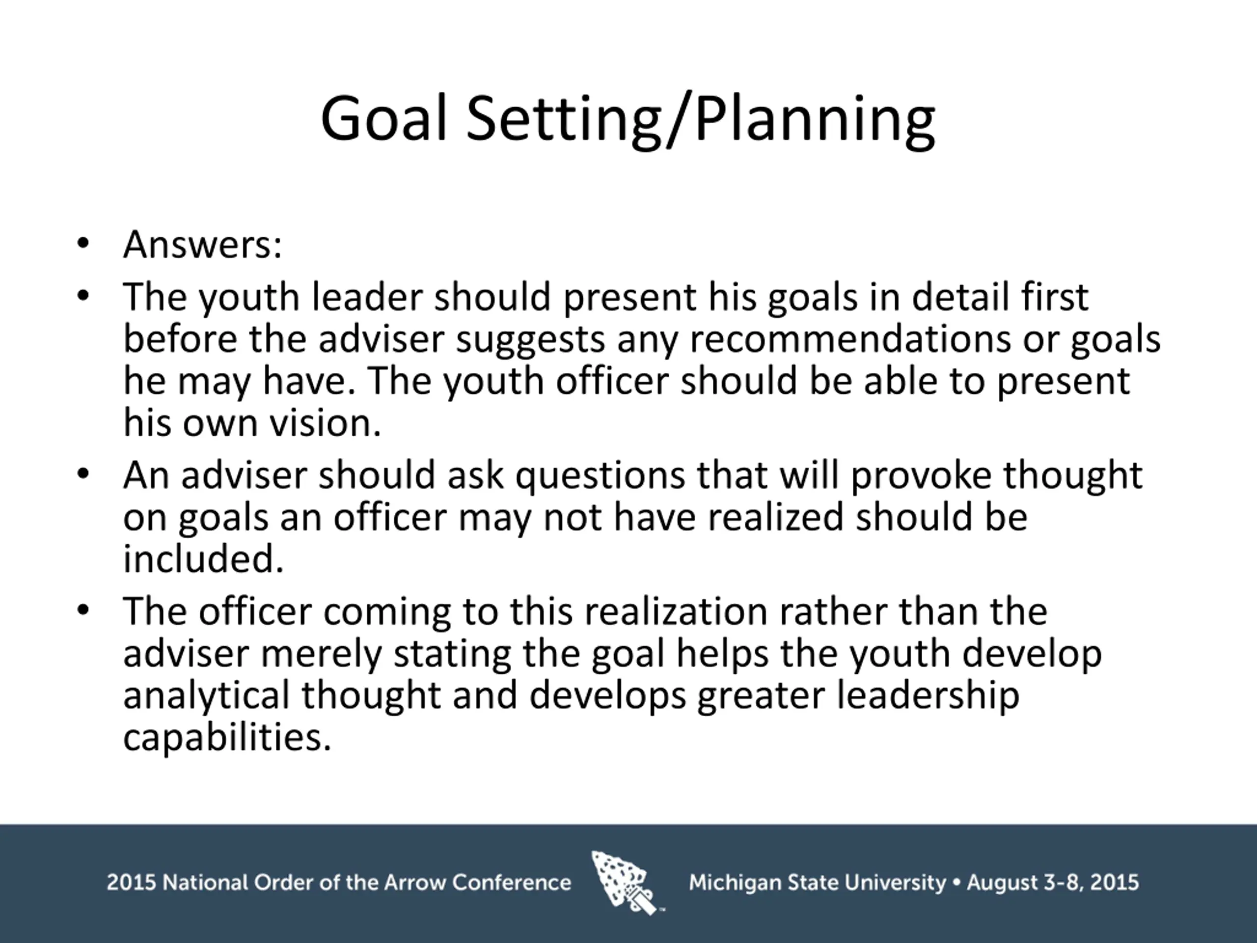 Goal Setting/Planning Answers: The youth leader should present his goals in detail first before the adviser suggests any recommendations or goals he may have. The youth officer should be able to present his own vision. An adviser should ask questions that will provoke thought on goals an officer may not have realized should be included. The officer coming to this realization rather than the adviser merely stating the goal helps the youth develop analytical thought and develops greater leadership capabilities.