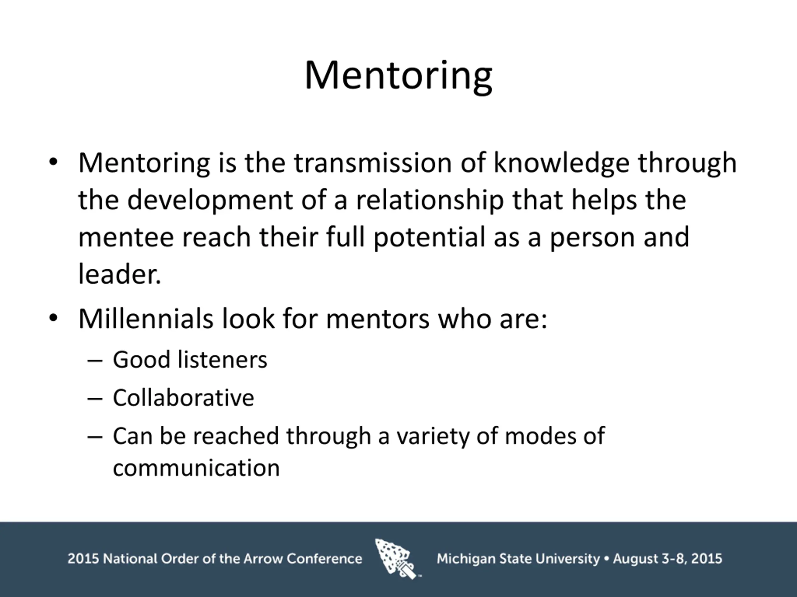 Mentoring Mentoring is the transmission of knowledge through the development of a relationship that helps the mentee reach their full potential as a person and leader. Millennials look for mentors who are: Good listeners Collaborative Can be reached through a variety of modes of communication