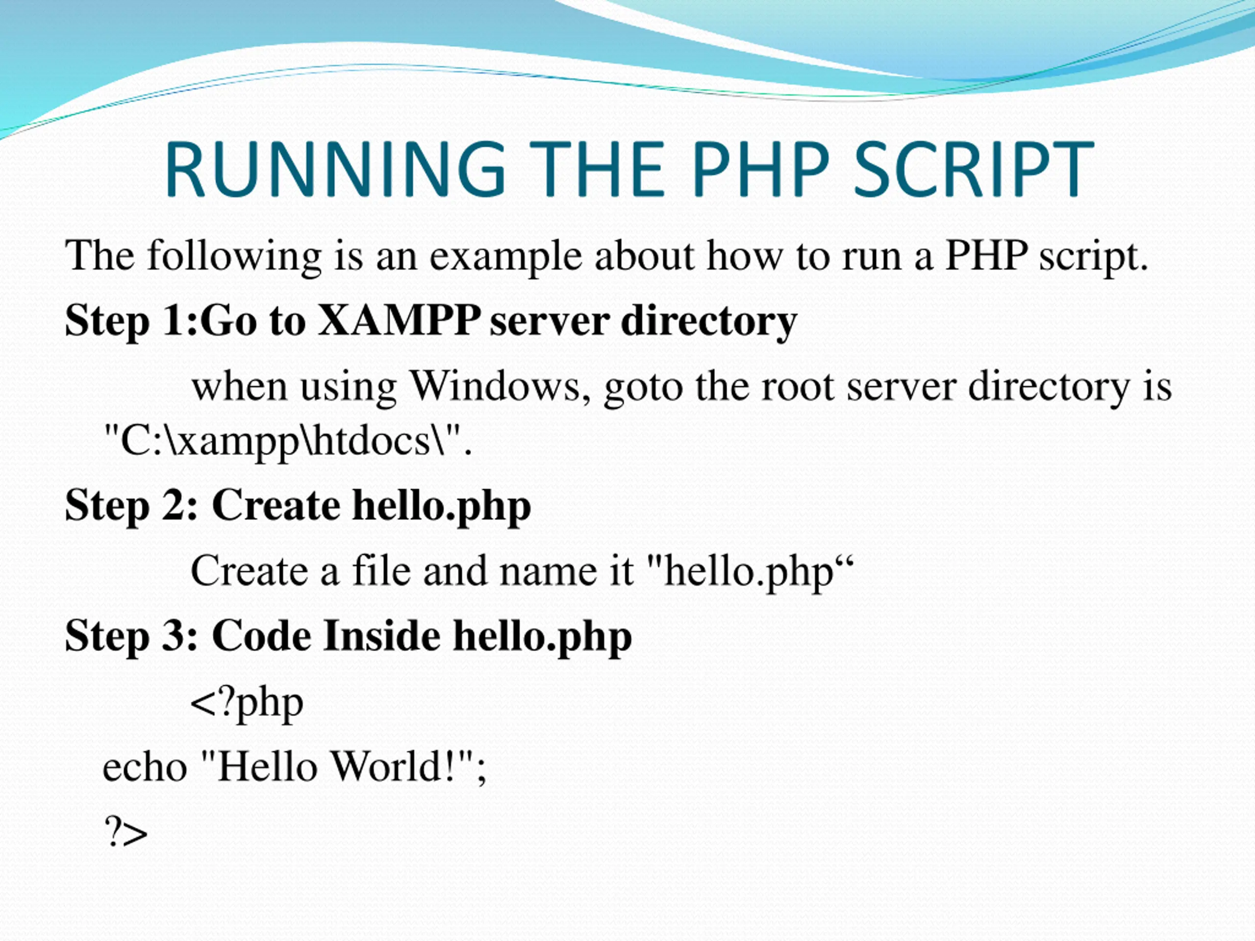 RUNNING THE PHP SCRIPT The following is an example about how to run a PHP script. Step 1:Go to XAMPP server directory when using Windows, goto the root server directory is "C:\xampp\htdocs\". Step 2: Create hello.php Create a file and name it "hello.php Step 3: Code Inside hello.php <?php echo "Hello World!"; ?>