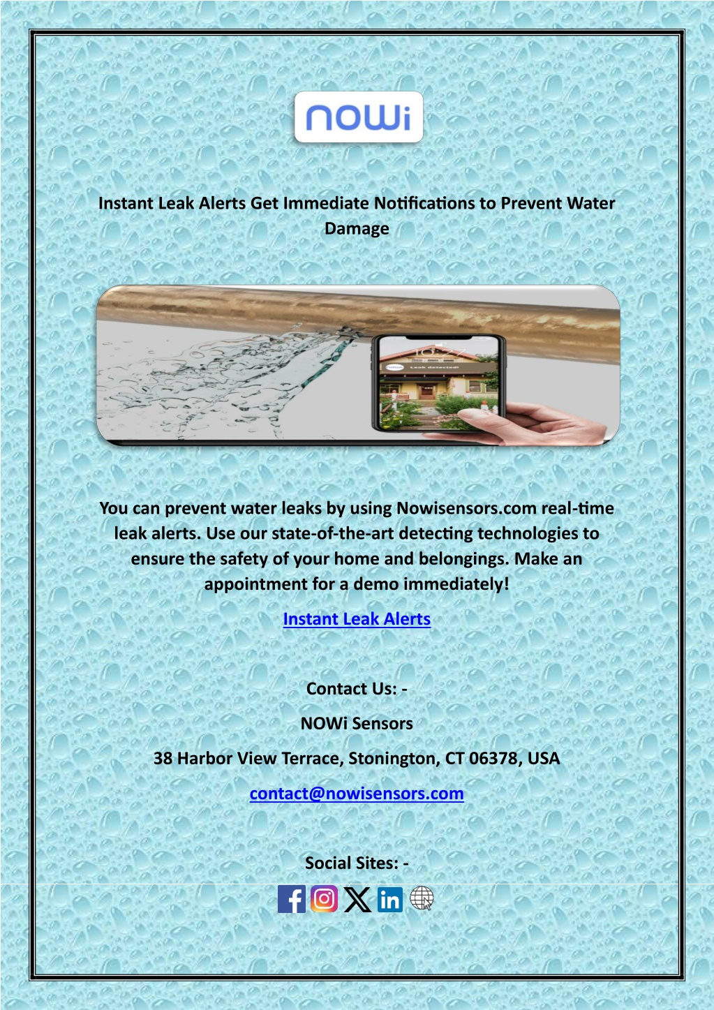 Instant Leak Alerts Get Immediate Notifications to Prevent Water Damage You can prevent water leaks by using Nowisensors.com real-time leak alerts. Use our state-of-the-art detecting technologies to ensure the safety of your home and belongings. Make an appointment for a demo immediately! Instant Leak Alerts Contact Us: - NOWi Sensors 38 Harbor View Terrace, Stonington, CT 06378, USA contact@nowisensors.com Social Sites: -